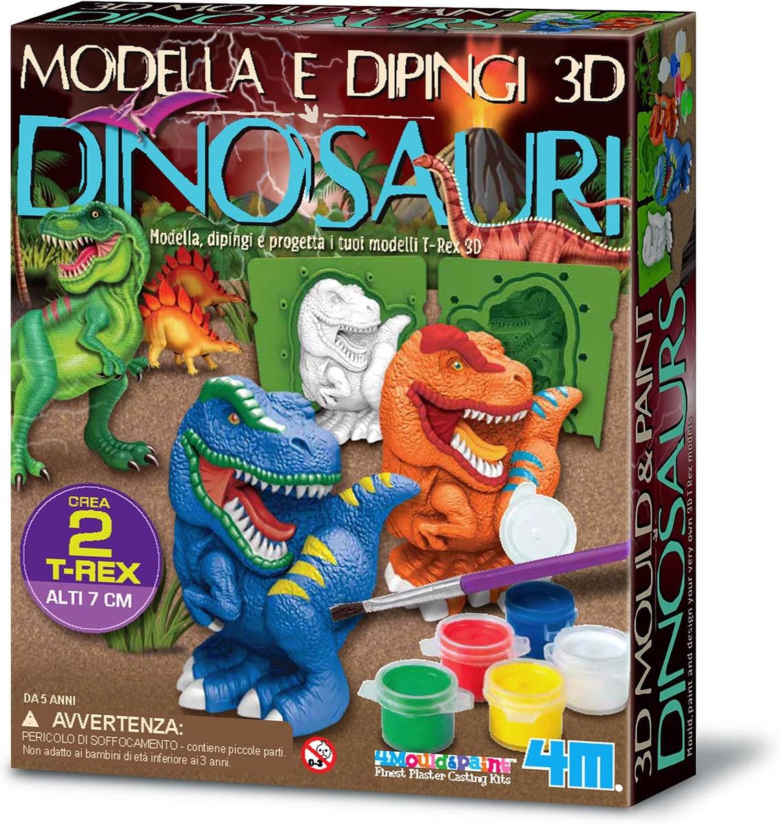 Σετ για τη δημιουργία 3D γύψινων φιγούρων Δεινοσαύρων 4M που σας επιτρέπει να φτιάξετε 6 χρωματιστούς δεινοσαύρους με τα δικά σας χέρια. Στο δημιουργικό εργαστήριο υπάρχουν κιτ με τα οποία μπορείτε να φτιάξετε φιγούρες δεινοσαύρων και να τις ζωγραφίσετε χρησιμοποιώντας γύψινη σκόνη, τρισδιάστατα καλούπια και χρώματα. Ένα υπέροχο δώρο για τους λάτρεις της παλαιοντολογίας ηλικίας 5-7 ετών.