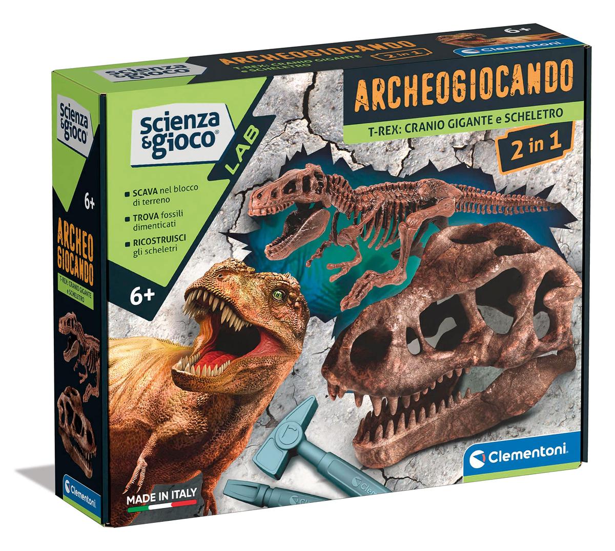 Un gioco scientifico alla scoperta di uno dei dinosauri pi temuti del Giurassico! Il kit contiene un mattone in gesso da scavare con martello e scalpello per recuperare tutte le parti del teschio del grande T-rex. Il bambino potr divertirsi a ricostruire il teschio e lo scheletro proprio come un vero paleontologo! Il kit contiene anche uno scheletro gigante da assemblare Ideato e progettato in Italia.