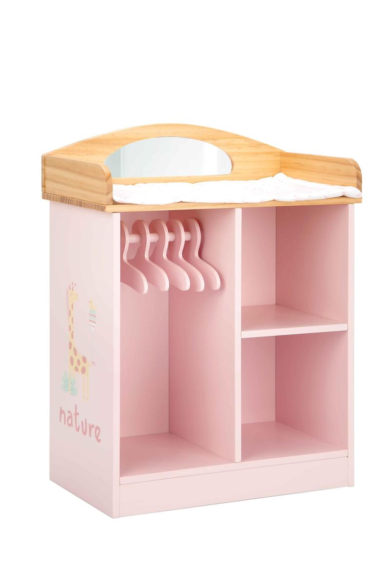 Doll changing station with an area to store doll clothes.Changing table dimensions: 37 x 20 x 48 cm.Made of wood.Painted pink and decorated with a playful illustration of animals.Set includes 5 hangers for doll clothes and a quilt.Carefully handcrafted with great attention to detail.Packaging measurements: 39 x 21 x 7.5cm.Recommended for ages 3 and up.Product bears the CE marking.Manufactured in China, designed byBLUE DOLLS S.L.U. (Spain).WARNING! Not suitable for children under 3 years. Small parts. Choking hazard.