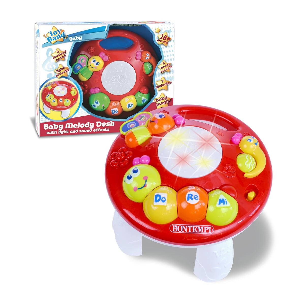 Baby μουσικό τραπέζι - 7 προηχογραφημένες μελωδίες - 3 μουσικές νότες - Γέλια μωρού - 2 κρουστά - Ρύθμιση έντασης - Μαγική εμφάνιση φώτων - Τροφ.: 3 μπαταρίες R6/AA 1,5V (δεν περιλαμβάνονται) - Διαστ.: 230x230x185 mm