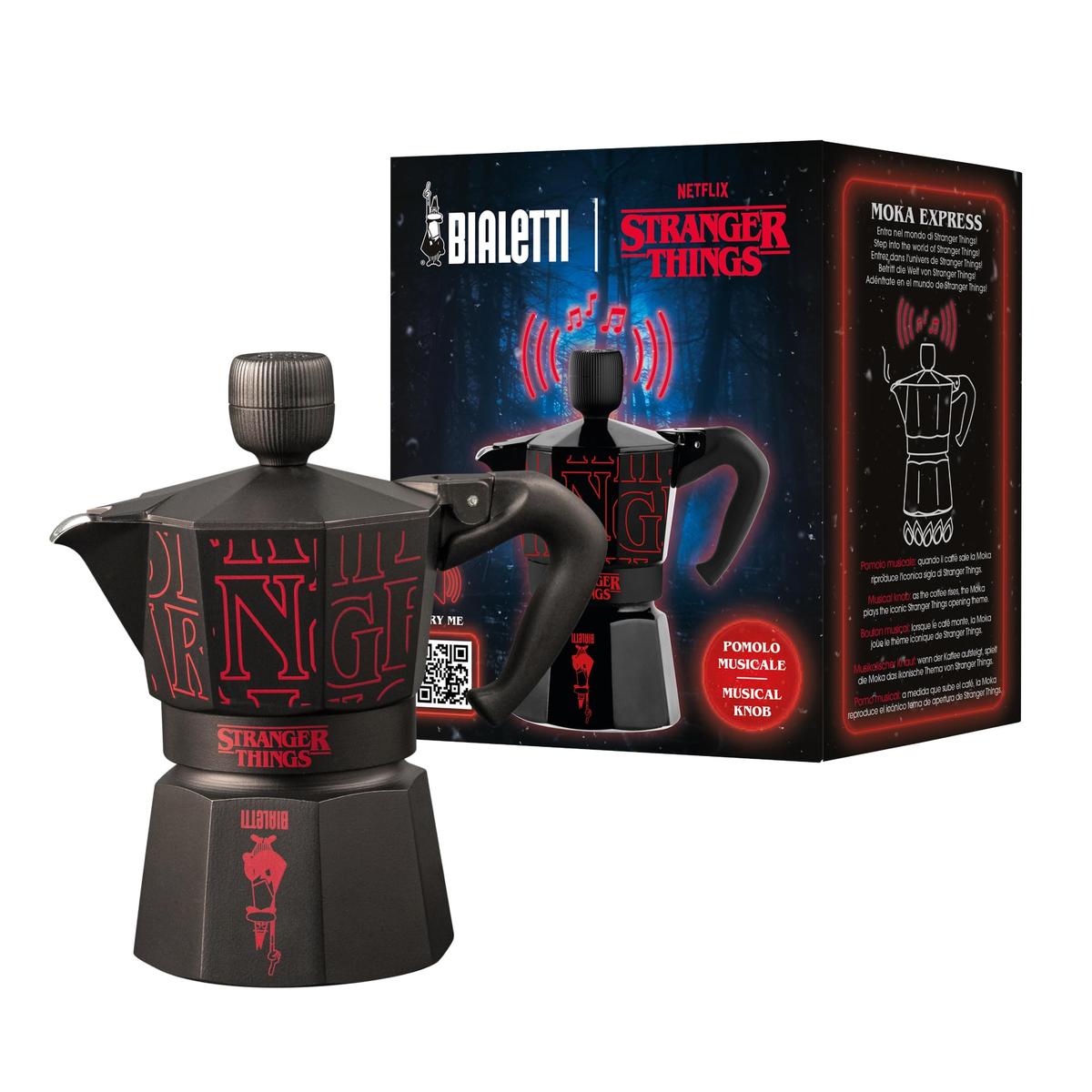 Design:This cast aluminum coffee pot impresses with its quality. The classic body, unchanged for decades, will make an original element of every kitchen. The knob and additional handle made of plastic provide comfortable handling and serving when your coffee is ready. Use:Bialetti Moka Express is suitable for gas or electric hobs. Put the product on the hob so that the handle is beyond the reach of heat.Wash your coffee pot by hand, without any detergents. Not dishwasher safe.Choosing the size of your coffee maker, keep in mind that every time you need to prepare the quantity of coffee specified by the manufacturer. How does moka work?The coffee maker constists of a top sealed tank, a filter and a bottom tank. Put ground coffee beans in the filter, pour water into the bottom tank below the safety valve level and connect all the elements. Put the coffee pot on the stove and wait a few minutes. Hot water moves to the top tank, flowing through the ground beans. Your delicious and aromatic espresso is ready!STRANGER THINGS TM/ Netflix. Used with permission.