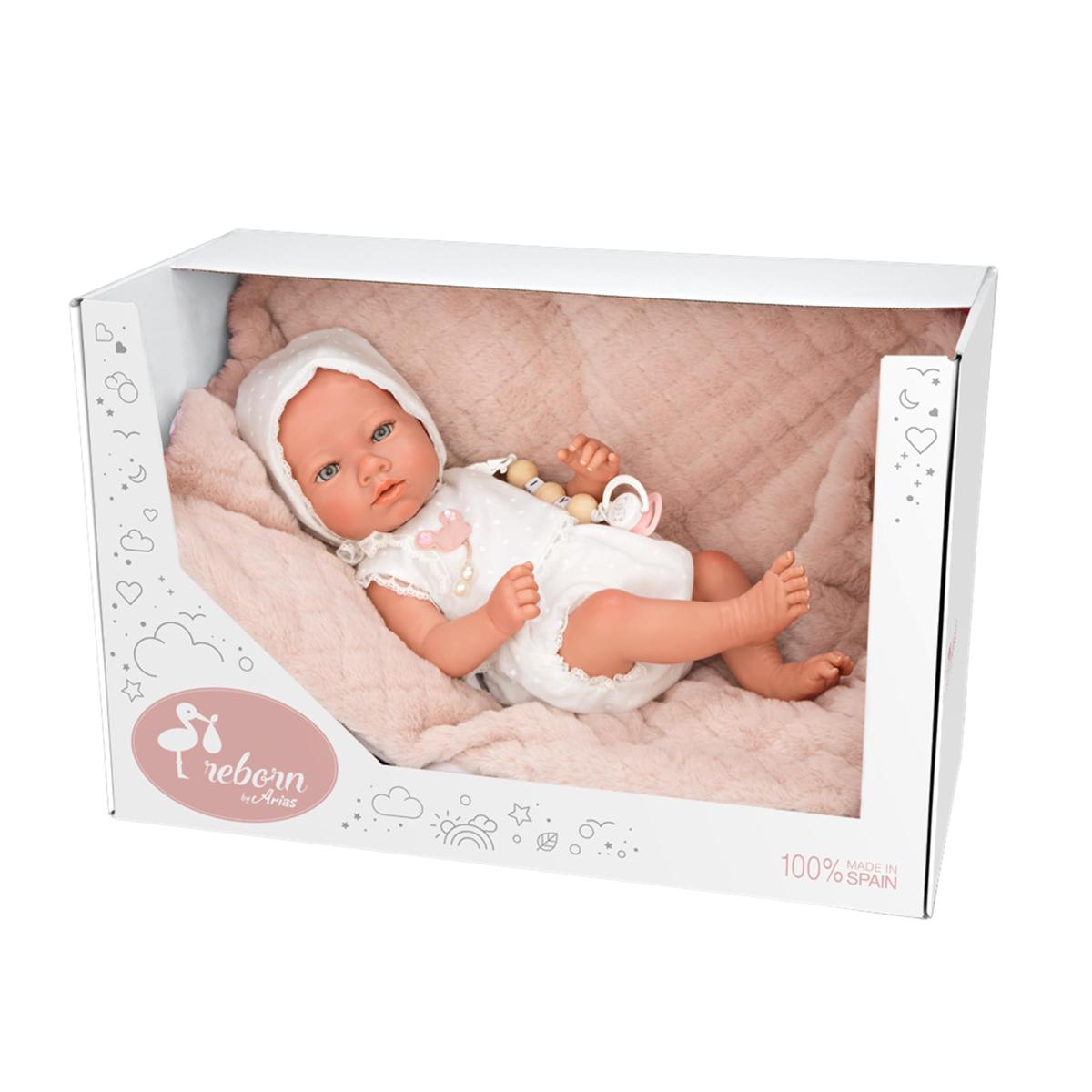 Handmade collectable Reborn doll with white clothingDoll height: 38 cm.The doll is weighted to resemble a weight of a real baby.Gender: female.The doll is wearing a nappy, white clothes and a matching bonnet.Detailed handmade clothing.Has a beautiful pink blanket.The doll comes with a dummy and a dummy clip.Expressive eyes that create the impression of a realistic sight-line.The doll is made of vinyl, which makes her very soft to touch.Hand painted details such as redness, typical for newborns, veins.Does not have hair.Packaged in a beautiful cardboard box, which makes the doll a perfect gift!Packaging size: 52 x 20 x 30 cm.The doll is provided with a certificate of authenticity.Recommended for ages 6 and up.Product bears the CE marking.Manufactured by BLUE DOLLS S.L.U., Spain.WARNING! Not suitable for children under 3 years. Small parts. Choking hazard.