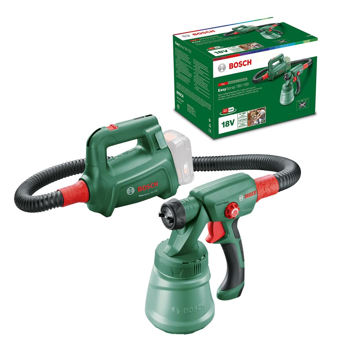 If you like to take care of every detail in your home and own the latest products that will make your life easier, purchase Electric Paint Sprayer Gun BOSCH EasySpray 18V-100 at the best price.Type: Airbrush pistolColour: GreenMaterial: MetalSuitable for: ExteriorCharacteristics: Ergonomic handleEasy to useVoltage: 18 VPower supply: BatteryBattery operated: YesIncludes: Carrying handleMounting instructionsNot included: BatteryBattery type: Litio Ion