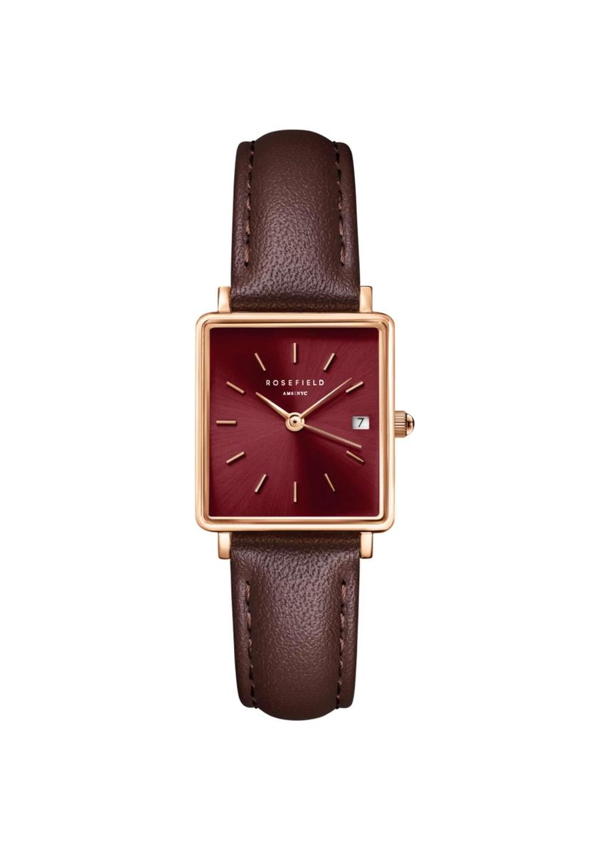 Boxy XS Watch Burgundy Sunray Dial Dark Brown Leather Strap Rose Gold Case