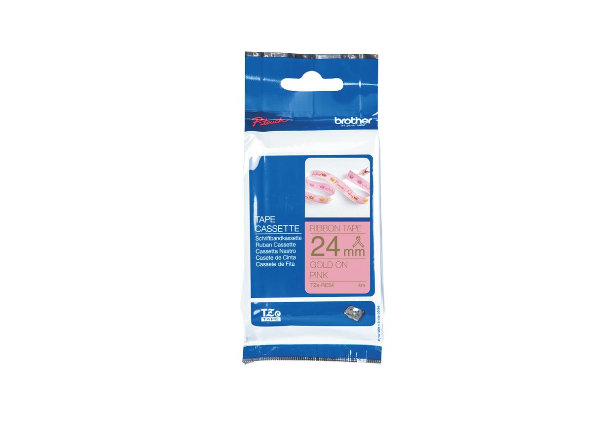 Brother TZE-RE54 Satin Ribbon 24 mm Gold Text on Pink Tape