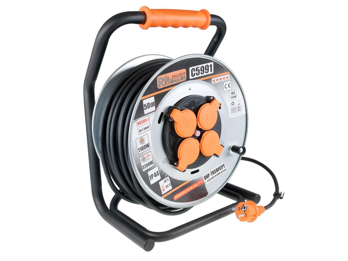 Professional extension reel. Main advantages,Sturdy, solid construction, quality rubberised cable for long service life even in abrasive environments,Fixed centre, the extender can be reeled to stretch without disconnecting appliances,IP44 protection against moisture.