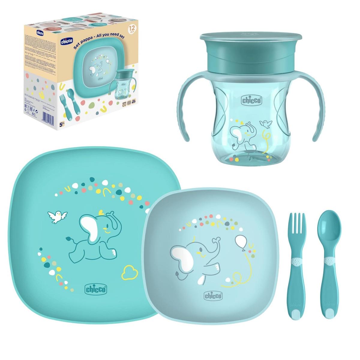 Chicco 12M Σετ Απογαλακτισμού Πλήρες Σετ Φαγητού με Κύπελλο, Μπολ, Πιάτο, Πιρούνι και Κουτάλι Μπλε Χωρίς BPA