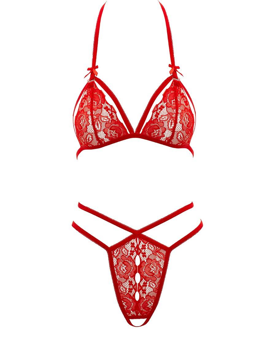 Cottelli Collection Lace Set Red XL Halterneck Bra with Crotchless String