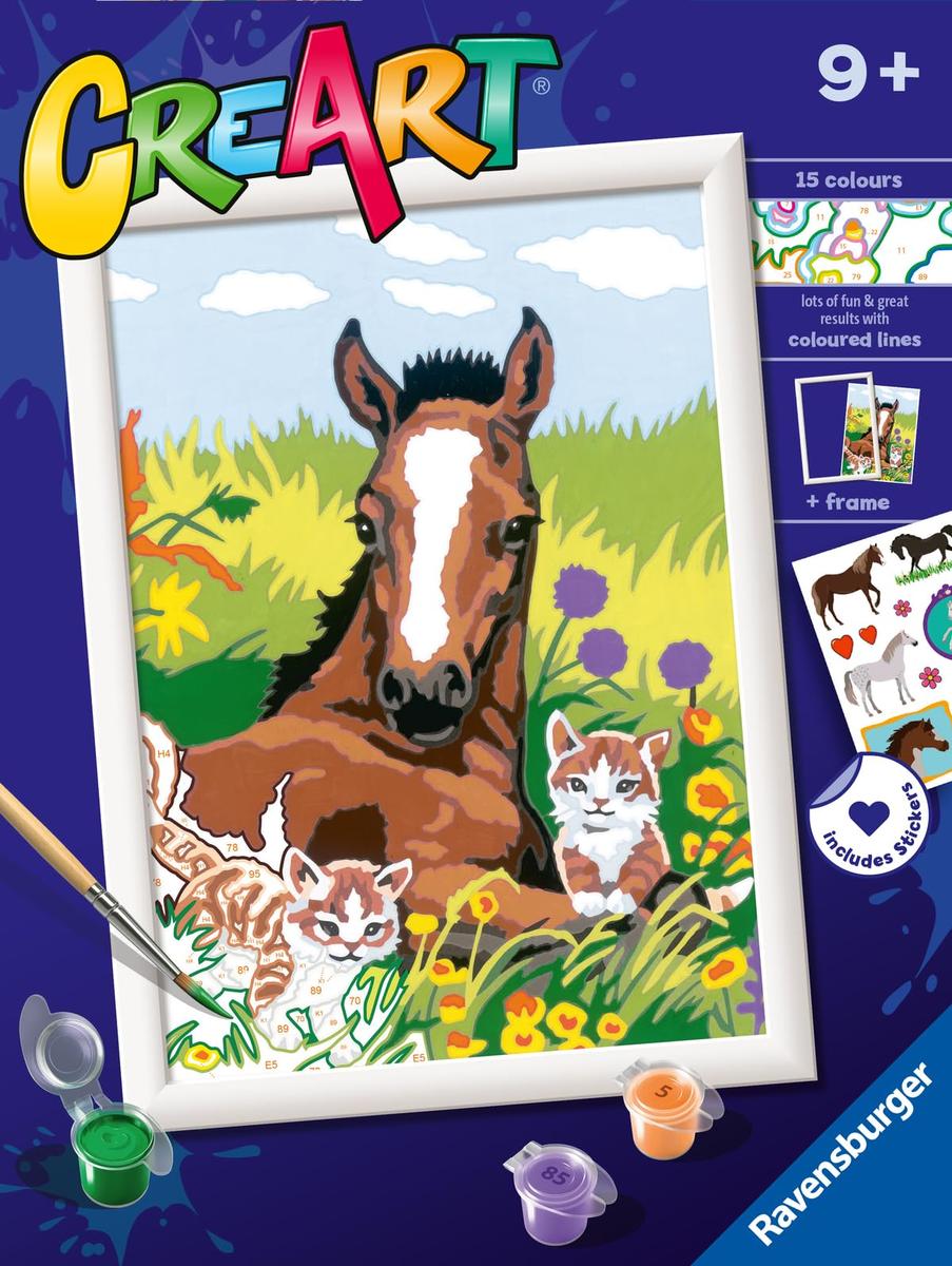 Όλοι μπορούν να ζωγραφίζουν με CreArt. Ο προεκτυπωμένος καμβάς περιλαμβάνει σχέδιο που καθοδηγεί τη δραστηριότητα με αριθμούς και χρωματιστά περιγράμματα που πληρώνονται με τα αντίστοιχα χρώματα για να διευκολύνουν τη ζωγραφική. Τα χρώματα σε υδατική βάση είναι έτοιμα για χρήση και δεν χρειάζονται κανένα διαλυτικό, κλείνουν εύκολα ώστε να ολοκληρώσετε το έργο ανά πάσα στιγμή. Τα δοχεία χρώματος είναι αναπλήρωσιμα