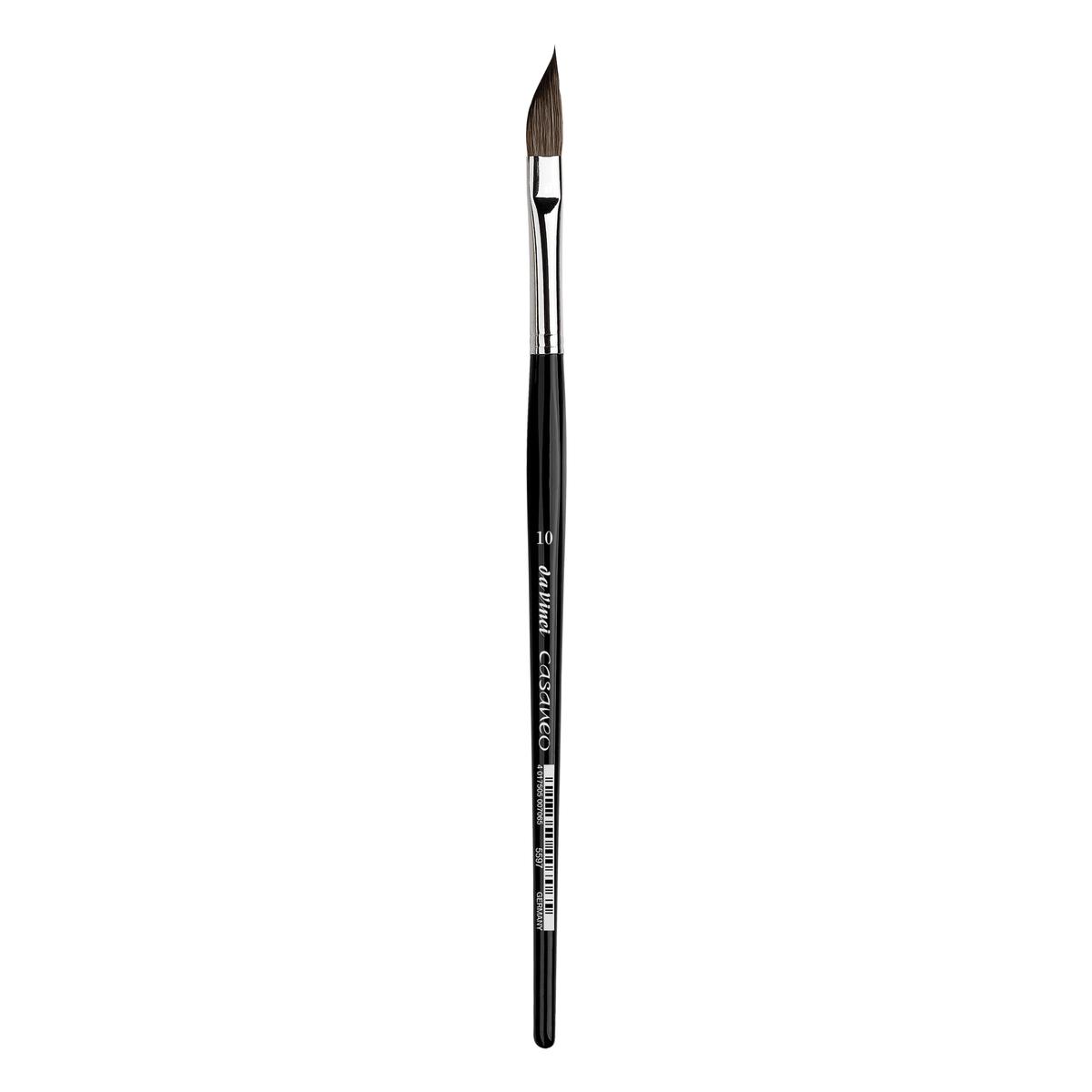 Το πινέλο με λοξή άκρη της σειράς da Vinci CASANEO έχει εξαιρετικά μαλακές συνθετικές ίνες. Έχει κοντή μαύρη γυαλισμένη εξαγωνική λαβή και ασημένιο περιτύλιγμα. Είναι κατάλληλο για ζωγραφική με χρώματα νερού.