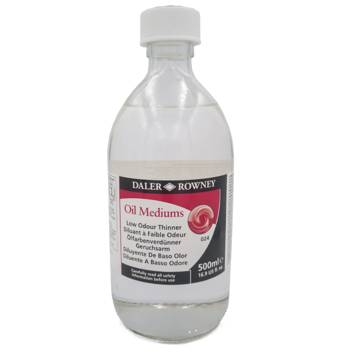 Oil diluent. By its very nature, oil colour is incompatible with water and dissolves only in turpentine, white spirit or low-odour thinners. Artists oil colours are made by dispersing pigments in an oil medium to create a smooth, slow-drying paint. The choice of oil mediums from the wide variety available depends on the surface and the finish required, and the working properties preferred during painting. Low-odour thinner dilutes oil colour to create thin, quick-drying washes in the early stages of painting and can also be used to clean brushes. Directions: Mix with oil paints until desired consistency. Also used directly to clean brushes and palettes.