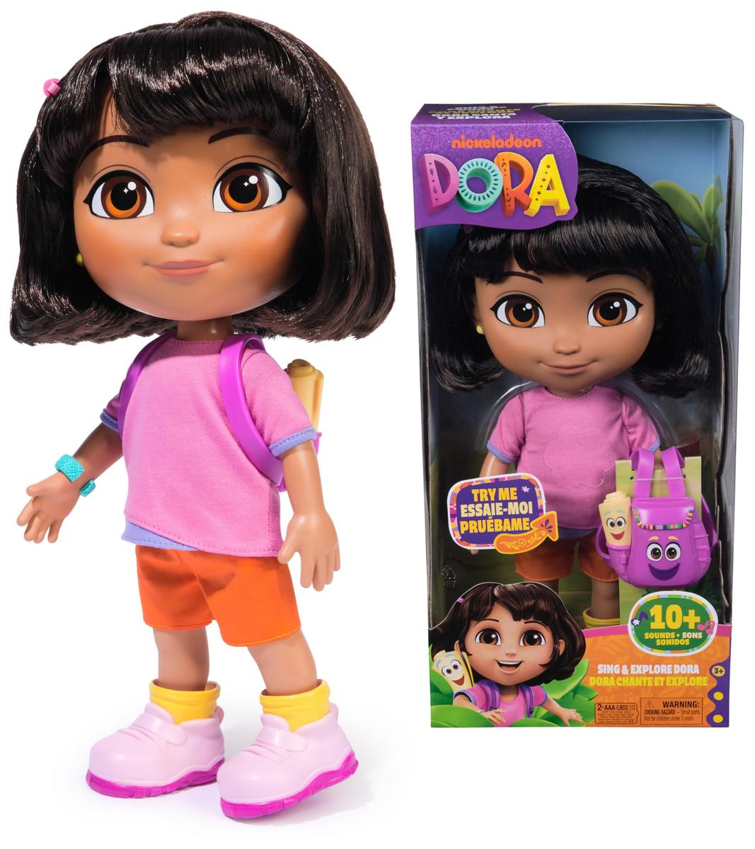 Adventures await with the Sing & Explore Dora doll! This 30,5 cm doll comes to life with movable limbs & sound fx, for realistic play, and includes doll house accessories like a hair clip, bracelet, and Dora's beloved Backpack. Squeeze Dora's belly, to hear thrilling music, sound effects, then squeeze Backpack to open the top. Dora's soft, rooted hair is perfecto for brushing, and her removable shoes and accessories for playing dress-up.