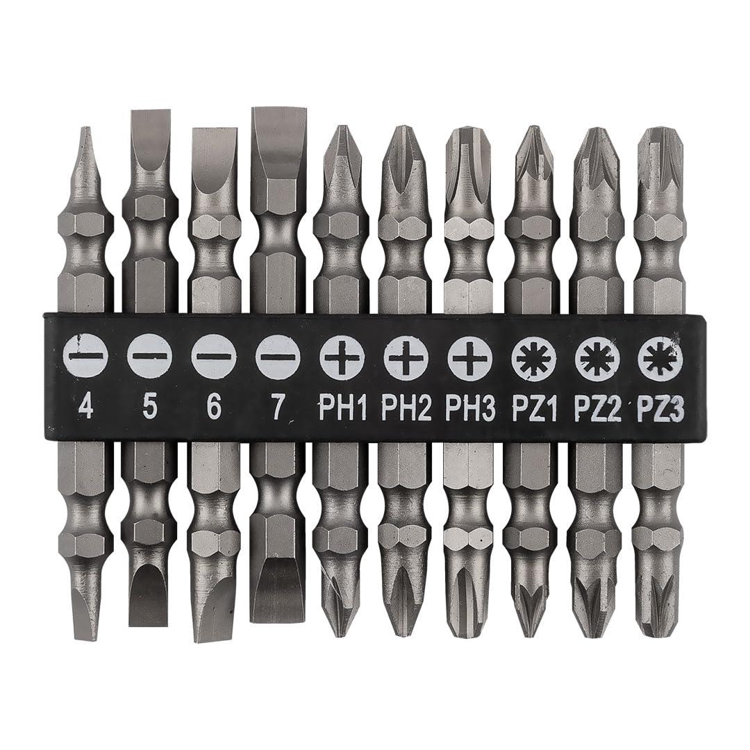Double-Sided Bit Set SL4/5/6/7, PH1/2/3, PZ1/2/3 x 65 mm 10 Pieces 1/4 Hex Shank CrV Steel