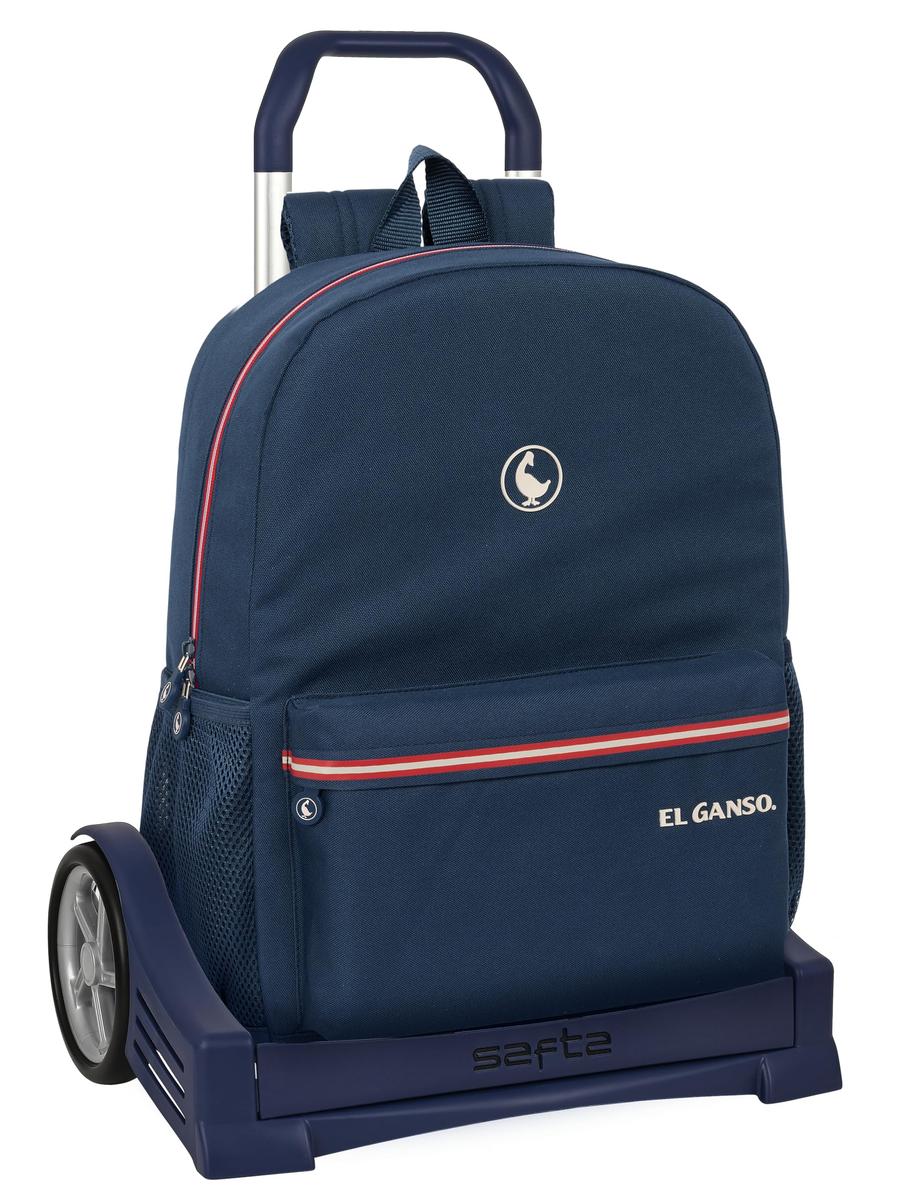 Return to the office without forgetting a single thing! Buy School Rucksack with Wheels El Ganso Classic Navy Blue 32 x 43 x 14 cm and be the envy of your colleagues!Type: School Rucksack with WheelsSchoolCompartments: 1 CompartmentIncludes: Water bottle side pocketFront pocket with zipGender: Children'sStyle: CasualColour: Navy BlueCharacteristics: ReinforcedErgonomic paddingRemovable TrolleyUpper handleAdjustment systemHeight: 85 cmMaterial: Polyester 900DType of fastening: ZipApprox. dimensions: 32 x 43 x 14 cm
