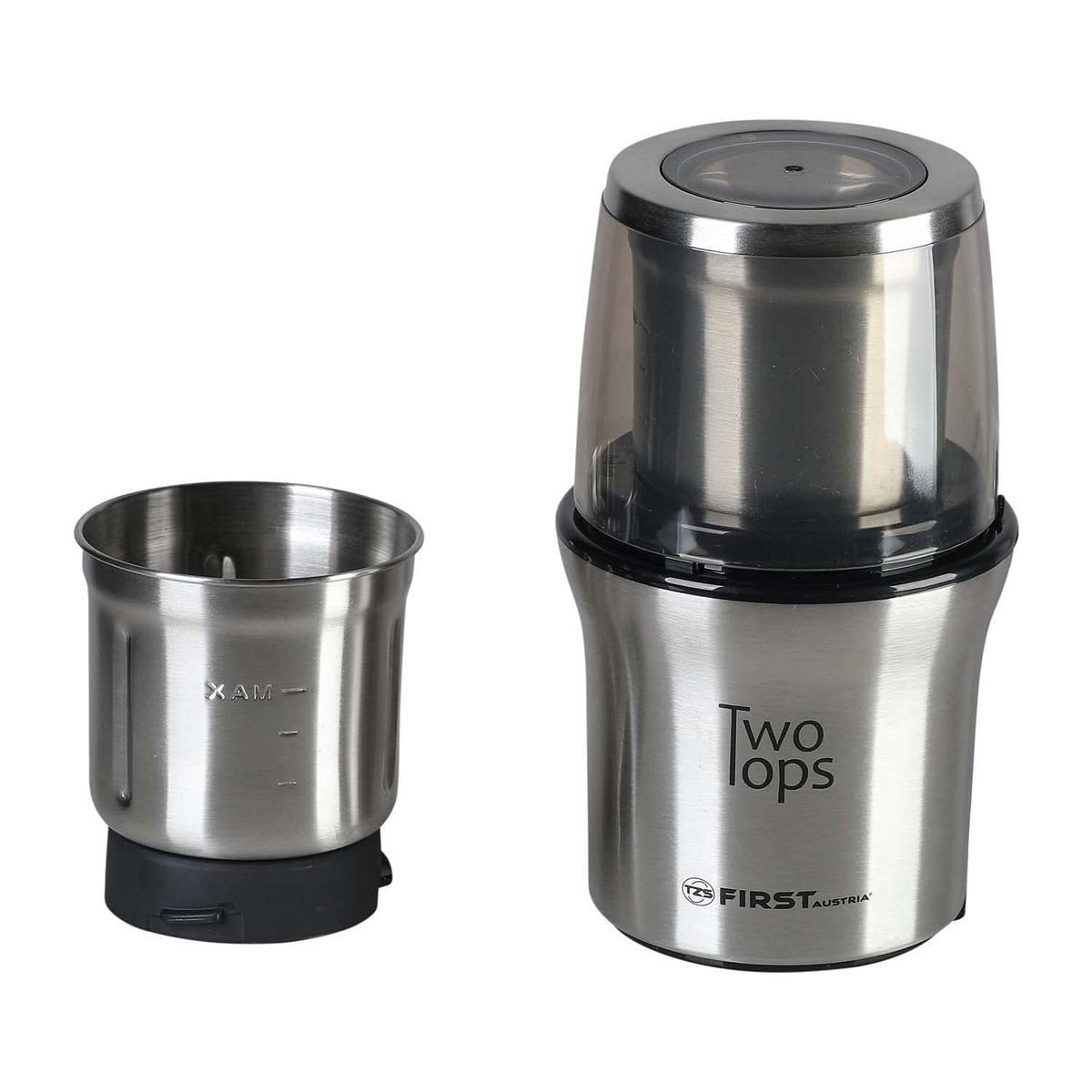 Λεπίδα από ανοξείδωτο χάλυβα και σώμα, χωρητικότητα άλεσης 70 g, χειρισμός με ένα χέρι, λειτουργεί μόνο όταν κλείνει το καπάκι, Δύο δοχεία από ανοξείδωτο χάλυβα, 230 V, 50 Hz, ισχύς 200 W. Ισχύς W: 200, χωρητικότητα g: 70