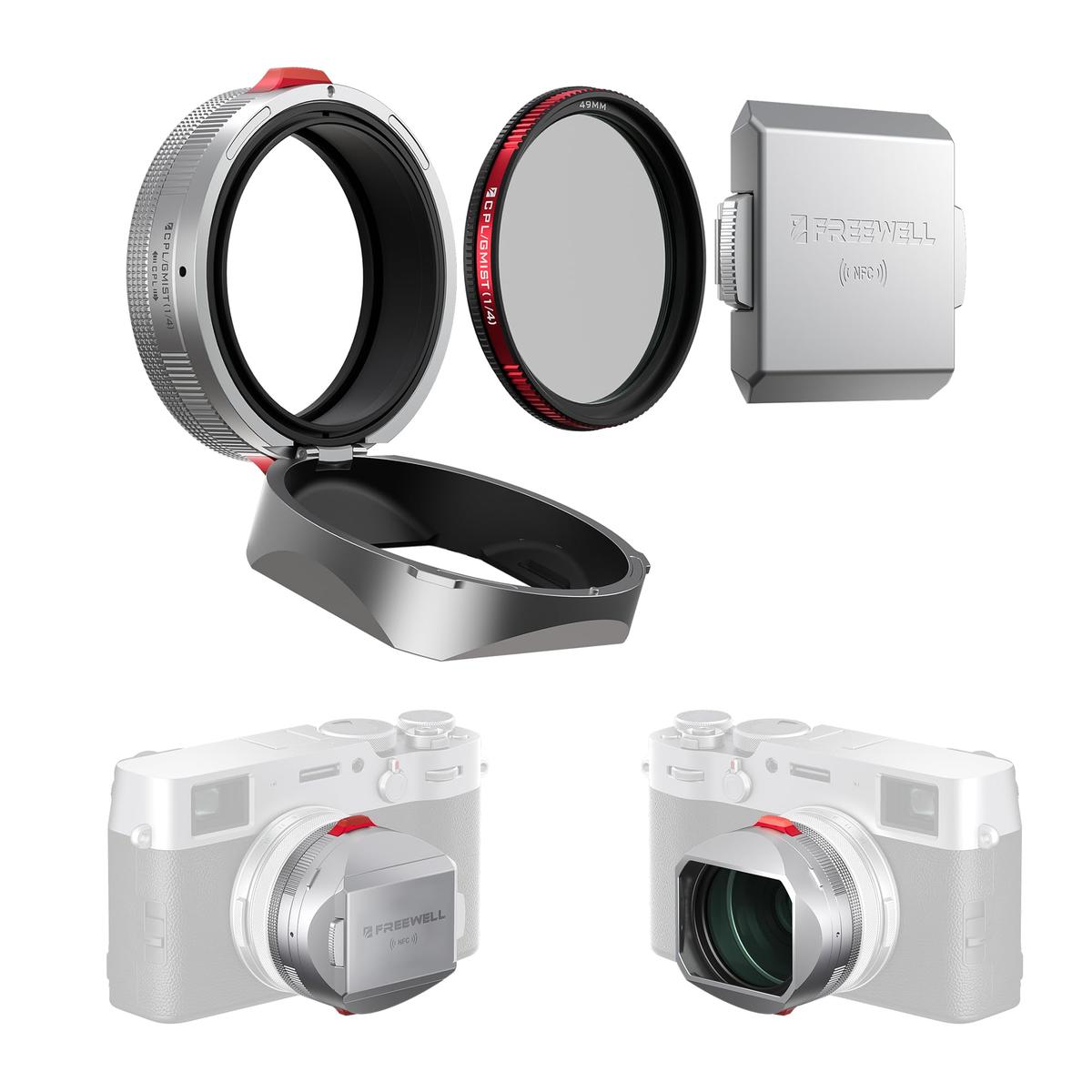 Freewell Sunshield for Fuji X100 Series (silver)The Freewell Sunshield for Fuji X100 Series offers lens protection and a built-in CPL/Black Mist filter (49mm). The polarizing filter reduces glare and improves color saturation, which works well for landscape photography, among other applications. The Black Mist effect softens light and is perfect for portraits and city shots.Quick adjustment and easy filter replacementThe CPL ring used makes it possible to adjust the filter quickly and conveniently - just rotate it with two handles. The hood itself can be easily opened and the filter can be replaced without complete disassembly. The system is compatible with other 49mm diameter filters.Lightweight, durable and ready for actionMade of CNC aluminum, the hood is lightweight and sturdy, making it an effective protection against dust and mechanical damage. The included magnetic cap with NFC technology facilitates quick access to the instructions, simply by bringing your smartphone close to it. The whole thing is designed for comfortable shooting in any conditions.IncludedsunshieldCPL/Gmist filtermagnetic NFC capcleaning clothManufacturerFreewellProduct codeFW-FU-XSRCompatibilityFuji X100 Series