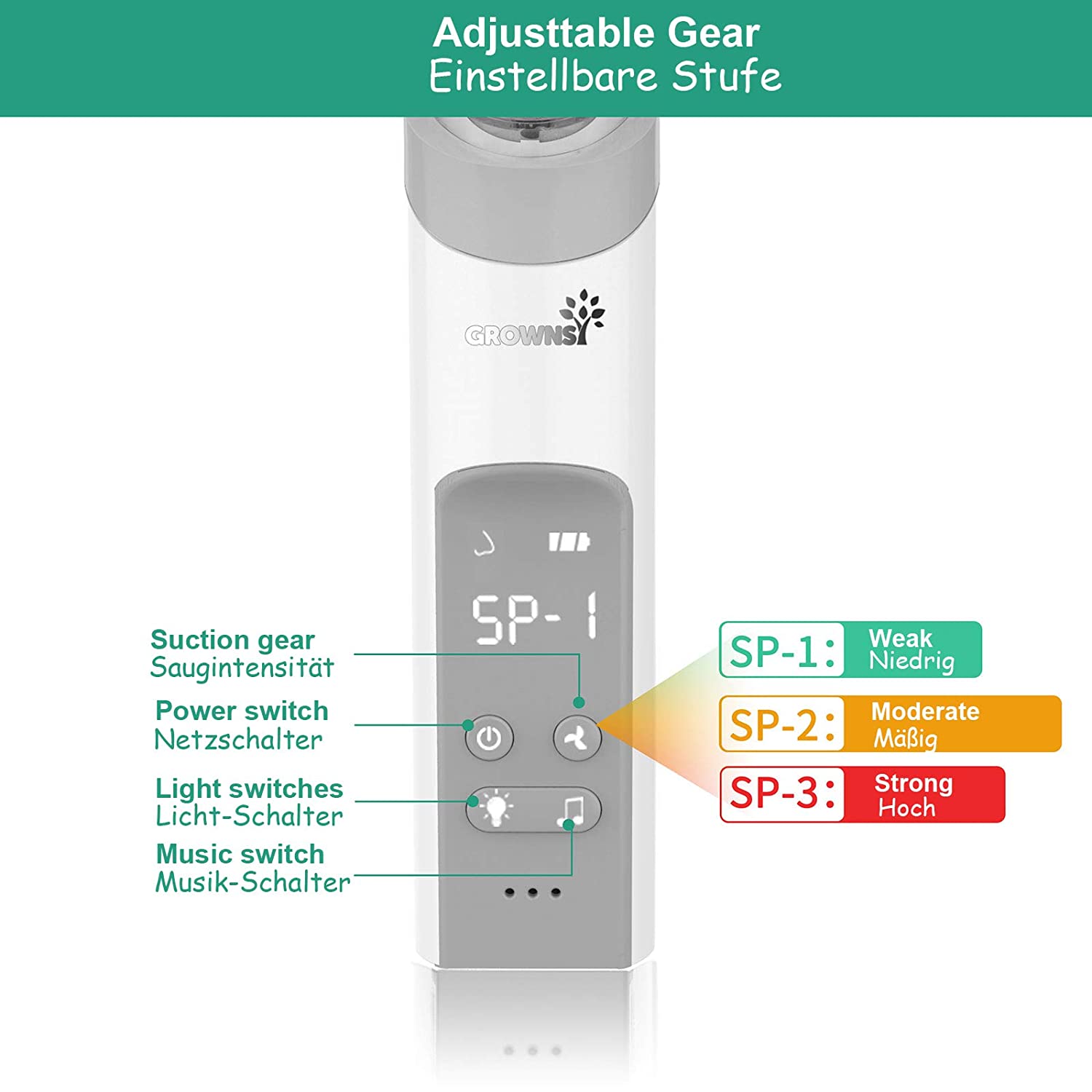 3 Saugkräfte3 Saugkräfte können an unterschiedliche Schleimdicken und das Alter der Kinder angepasst werden |