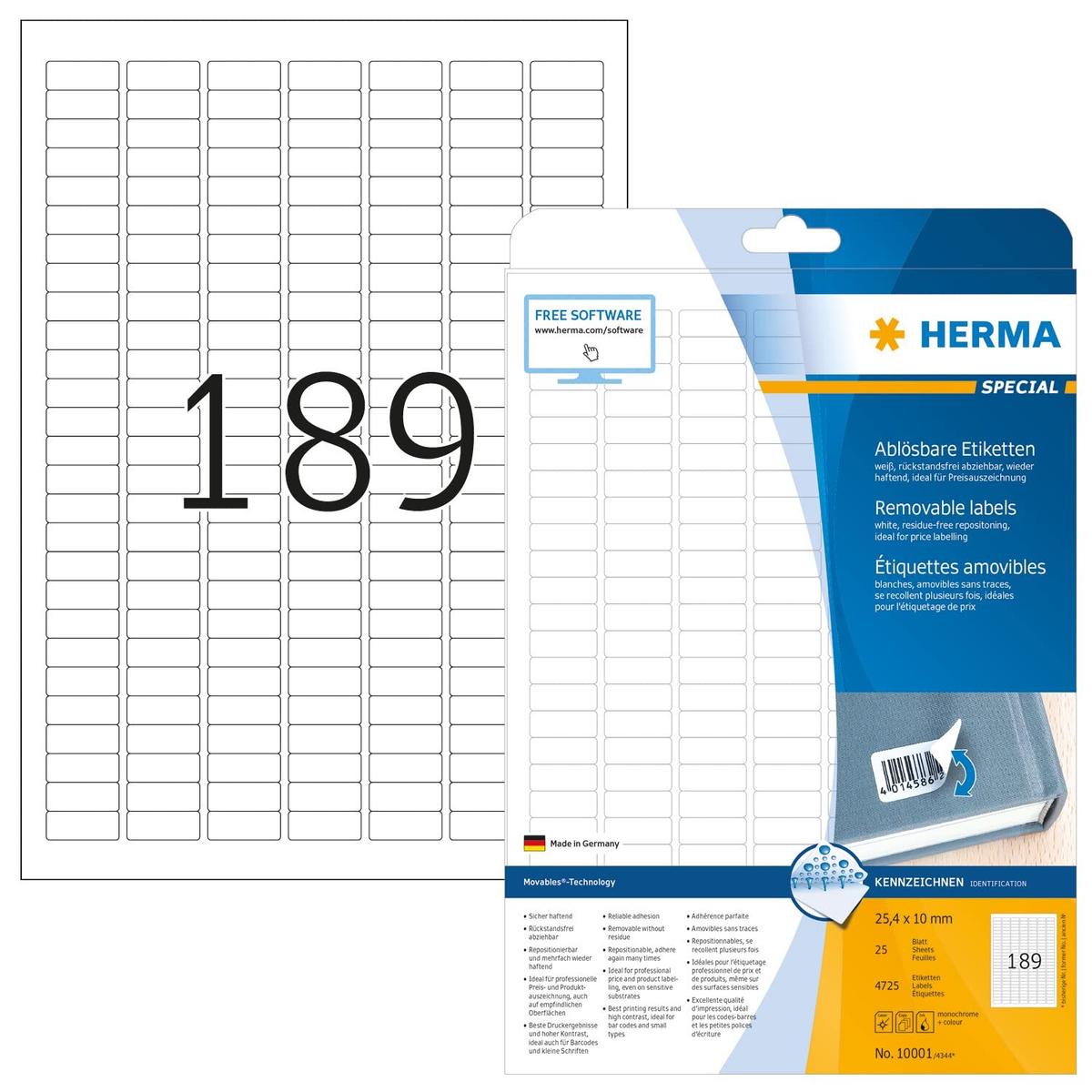 Herma Removable Labels 25.4 x 10 mm White A4 Sheets 4725 Pieces