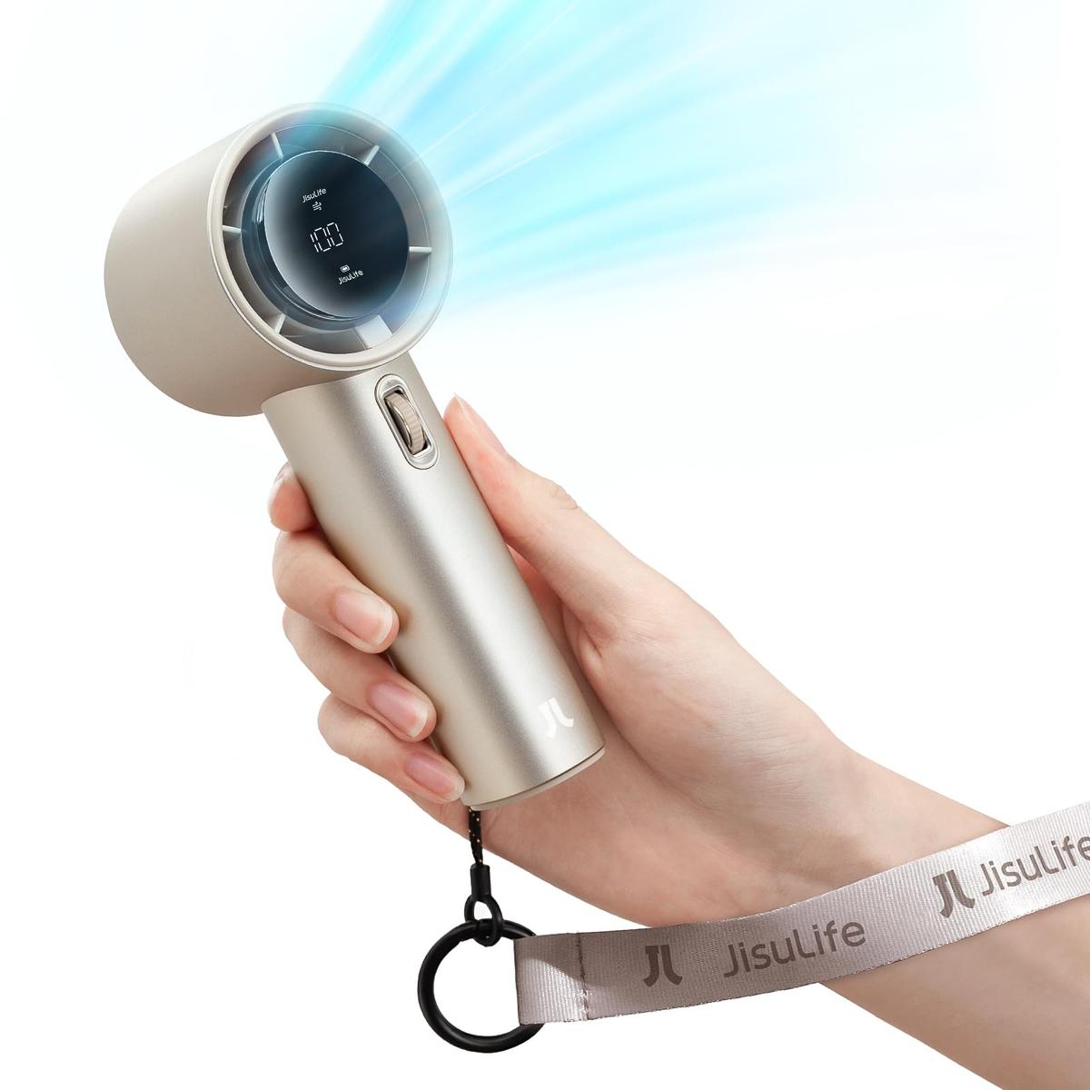 JISULIFE Portable Hand Fan Mini Turbo Fan Adjustable Speed 1 to 100 Rechargeable 5000 mAh Battery Metal Body Digital Display Brown
