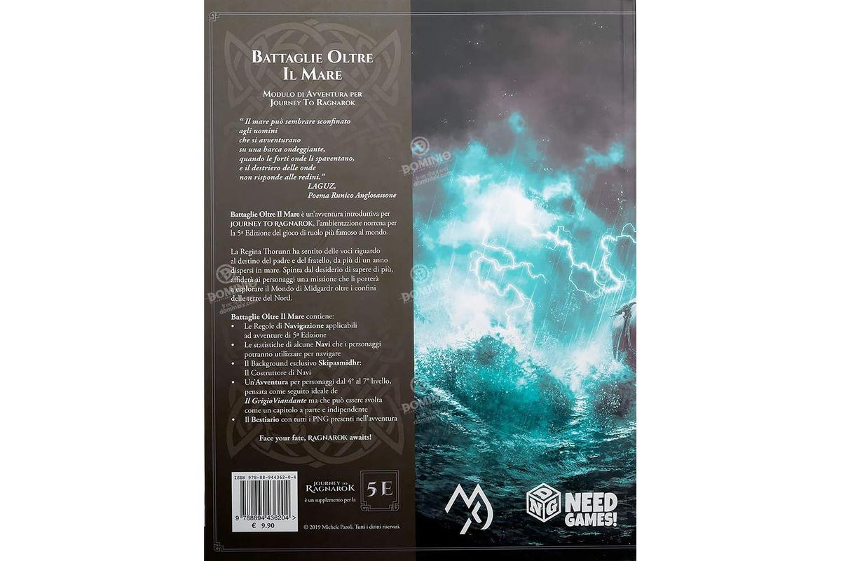 Battaglia Oltre il Mare είναι η συνέχεια του ενότητας περιπέτειας του Il Grigio Viandante που σας οδήγησε στο τέταρτο επίπεδο των χαρακτήρων. Αυτή η νέα περιπέτεια για χαρακτήρες από τέταρτο έως έβδομο επίπεδο θα σας επιτρέψει να συνεχίσετε τις κατακτήσεις σας στο παιχνίδι ρόλων Journey to Ragnarok, μια νορβηγική επανερμηνεία του συνόλου κανόνων της πέμπτης έκδοσης του Dungeons