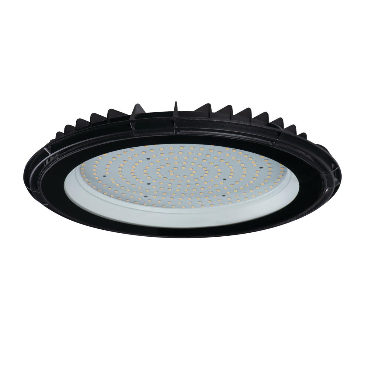 Βιομηχανικό φωτιστικό LED, τροφοδοσία 220-240V~; 50Hz, ισχύς 150W, ενσωματωμένη πηγή φωτός LED, φωτεινή ροή 15000lm, ουδέτερο λευκό χρώμα 4000K, διάρκεια ζωής πηγής φωτός 20000h; αριθμός κύκλων on/off: 25000; εύρος θερμοκρασίας περιβάλλοντος: -20°C έως 40°C; γωνία δέσμης 110°, Ra 80, IP 65, σώμα: κράμα αλουμινίου, υλικό προστατευτικού γυαλιού: σκληρυμένο γυαλί.