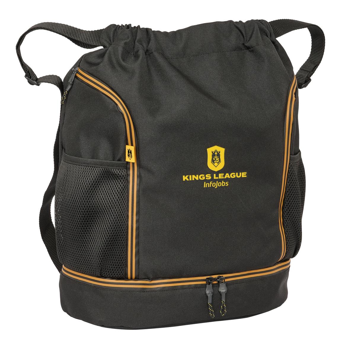 Return to the office without forgetting a single thing! Buy Backpack with Strings Kings League Black 35 x 40 x 1 cm and be the envy of your colleagues!Type: School BagBackpack with StringsCompartments: Main compartmentInterior pocketWater bottle side pocket x 2Zipped lower compartmentSide pocket x 2Colour: BlackCharacteristics: Water repellantAdjustable strapsGender: YoungMaterial: Polyester 600DType of fastening: ZipStrapsApprox. dimensions: 35 x 40 x 1 cm