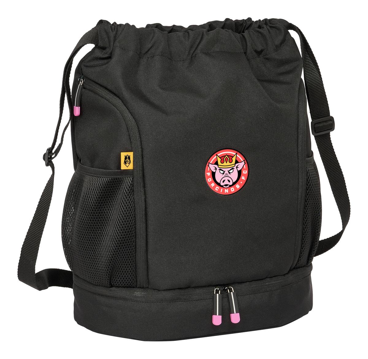Return to the office without forgetting a single thing! Buy Backpack with Strings Kings League Porcinos Black 35 x 40 x 1 cm and be the envy of your colleagues!Type: School BagBackpack with StringsCompartments: Main compartmentInterior pocketWater bottle side pocket x 2Zipped lower compartmentSide pocket x 2Colour: BlackCharacteristics: Water repellantAdjustable strapsGender: YoungMaterial: Polyester 600DType of fastening: ZipStrapsApprox. dimensions: 35 x 40 x 1 cm