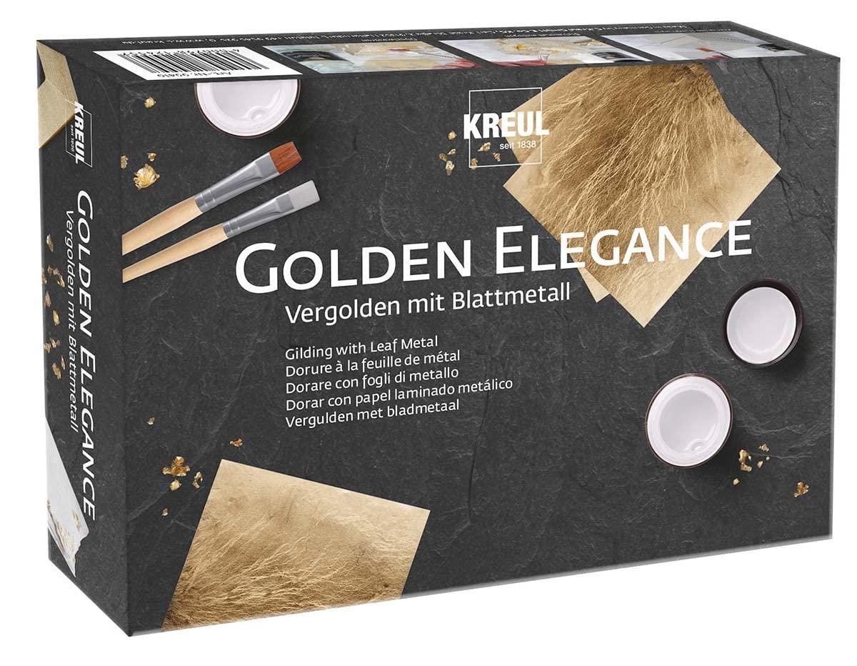 Ολοκληρωμένο σετ για χρυσοποίηση με φύλλα μετάλλου. Ο χρυσός λάμψη μετατρέπει τα αγαπημένα σας αντικείμενα σε κάτι μοναδικό. Με το σετ χρυσοποίησης KREUL Golden Elegance, αυτό επιτυγχάνεται εύκολα. Το ολοκληρωμένο σετ περιέχει όλα όσα χρειάζεστε για χρυσοποίηση διακοσμητικών αντικειμένων. Από φύλλα μετάλλου χρυσού, μέσω της ειδικής κόλλας για την εφαρμογή του μετάλλου, έως τα κατάλληλα πινέλα, όλα περιλαμβάνονται.
