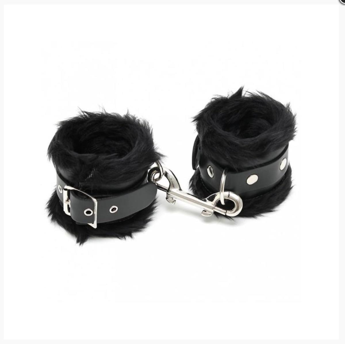 Leather Handcuffs with Fur 7 cm Black