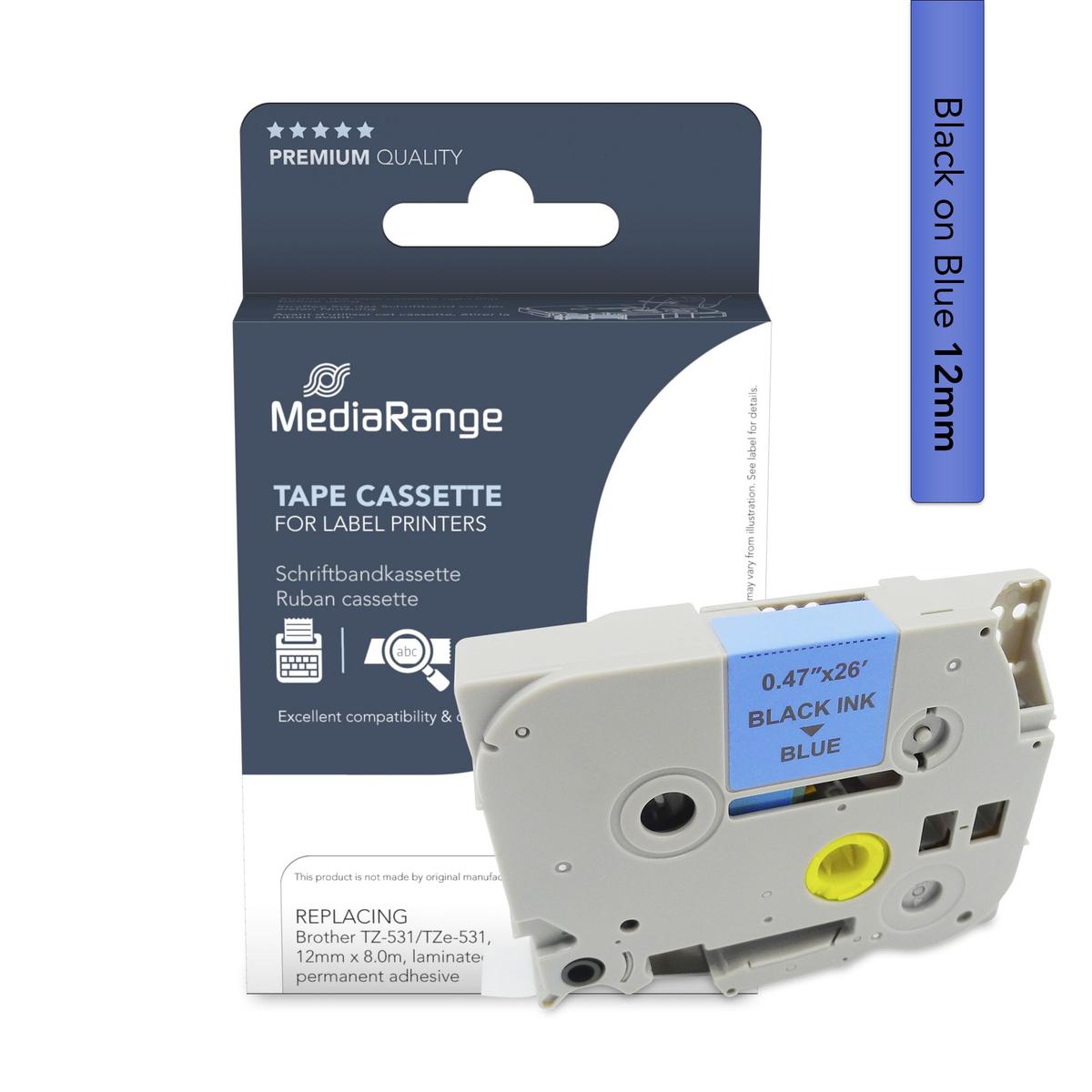 MediaRange Plastic Tape Cartridge 12 mm x 8 m Black on Blue Replace Brother TZ-531/TZe-531