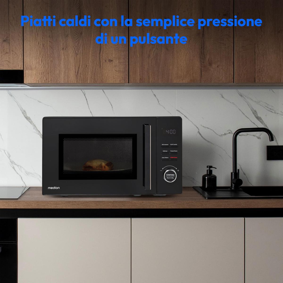 Φούρνος μικροκυμάτων (Επιδαπέδια συσκευή), Χρώμα: Μαύρο, με λειτουργία σχάρας 20 l Χώρος μαγειρέματος, με Φωτισμό LED Λειτουργίες: Μικροκύματα (800 W), Σχάρα (1000 W) Περιεχόμενα: Περιστρεφόμενος δίσκος από γυαλί, Σχάρα Διαστάσεις: Π 44 εκ x Ύ 25,9 εκ x Β 34,5 εκ