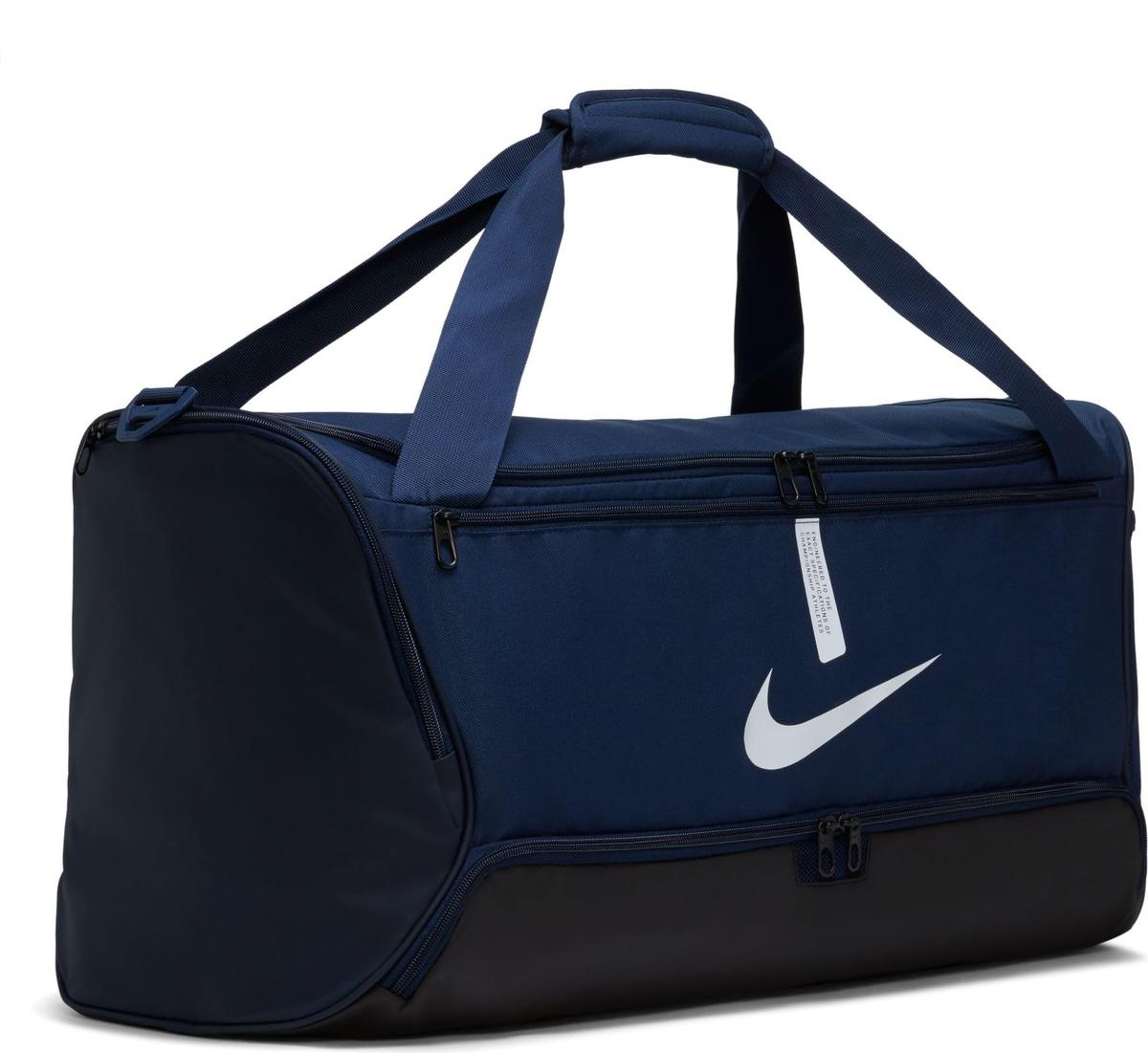 Bag Nike Academy Team navy CU8090 410 Properties: The functional Nike sports bag will surprise you with its capacity and convenient storage. Durable construction made of strong polyester. The main compartment is equipped with a lock. The inner pocket allows you to safely store documents, keys and money. There is also a place for small items in the outer zippered pocket. Design with a separate lower compartment. Reinforced, coated bottom. Long shoulder strap with adjustment and textile overlay. Short, braided handles with a connecting flap. Technical data: Material: 100% polyester Dimensions: 64 cm (height) 30 cm (width) 31 cm (height) Capacity: 60 l