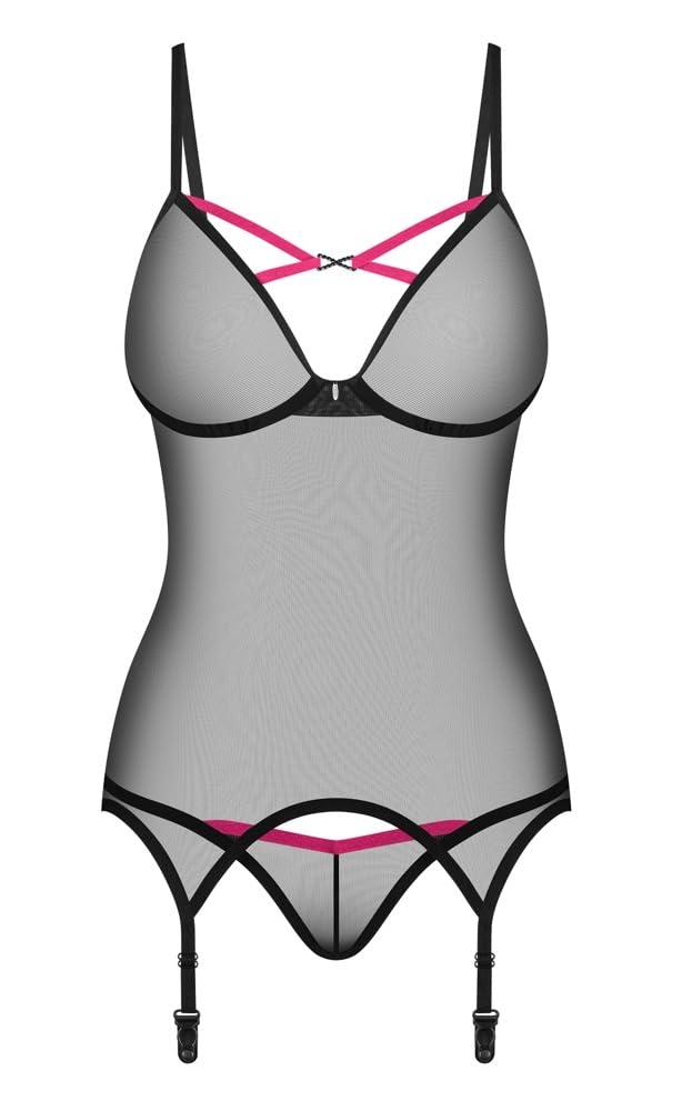 Subtle lingerie that tempts with intriguing details! The black corset and thong from the Novenes collection wraps a woman's body with delicacy. Extremely pleasant to the touch, transparent material, shiny pendant between the breasts, colorful straps and integral garter straps will make you stay in the center of attention all evening. Spandex 6 % polyamide 94 % SizeHipsChestM/L95-105 cm90-99 cmXL/XXL106-116 cm100-109 cmXS/S84-94 cm80-89 cm