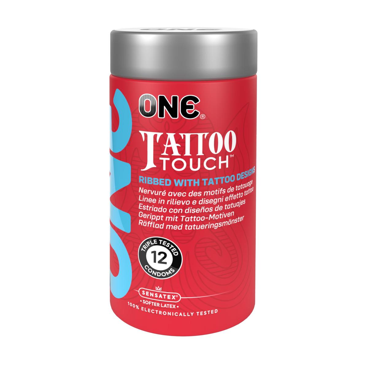 Ένα στυλ τατουάζ που μπορείτε να αισθανθείτε! Τα χρωματιστά προφυλακτικά Tattoo Touch από την ONE συνδυάζουν μια υφαίνουσα επιφάνεια με ένα ειδικό σχέδιο τατουάζ. Οι μεγάλες αυλακώσεις δεν είναι μόνο ένας προσελκυστικός παράγοντας, παρέχουν επίσης πρόσθετη διέγερση. Το περιγραμμένο σχήμα με άκρο σαν θηλή σημαίνει ότι είναι μια τέλεια και άνετη εφαρμογή το εξαιρετικά μαλακό φυσικό καουτσούκ λάτεξ Sensatex παρέχει φυσικό αίσθημα