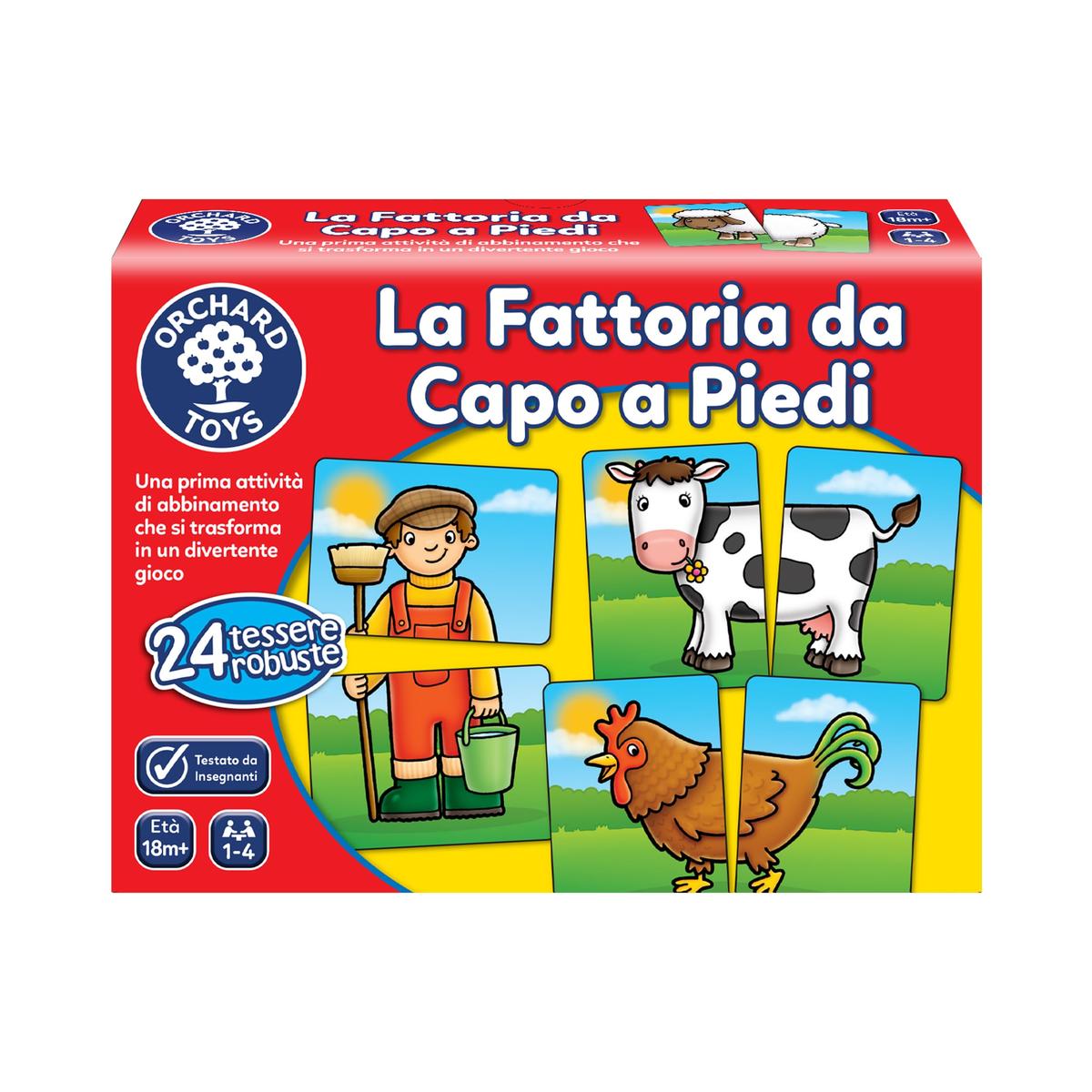 Questo colorato gioco a tema fattoria pu essere giocato sia come gioco di abbinamento per un singolo giocatore che come gioco di memoria. I giocatori pi piccoli possono iniziare girando tutte le tessere della fattoria con l'immagine rivolta verso l'alto e cercando di abbinare le parti della testa e della coda. Questa attivit di abbinamento la pi semplice ma l'attivit pu essere modificata, per un gioco pi avanzato, girando le tessere con l'immagine rivolta verso il basso e giocando come un gioco di abbinamento e di memoria. I bambini possono anche sviluppare le loro abilit matematiche contando le loro coppie alla fine del gioco. Con dodici simpatici personaggi della fattoria e oggetti da abbinare, La Fattoria da Capo a Piedi incoraggia le capacit di osservazione e di memoria ed allo stesso tempo introduce i bambini molto piccoli al concetto del gioco a turni! I bambini adoreranno le illustrazioni simpatiche e colorate e le tessere grandi e robuste sono l'ideale per le piccole mani. Alla fine del 2016, La Fattoria da Capo a Piedi ha vinto il premio di bronzo nei prestigiosi premi Mother & Baby nella categoria Miglior giocattolo per bambini sotto i 24 mesi. Contenuto: 24 tessere robuste (12 coppie) 1 foglio di istruzioni