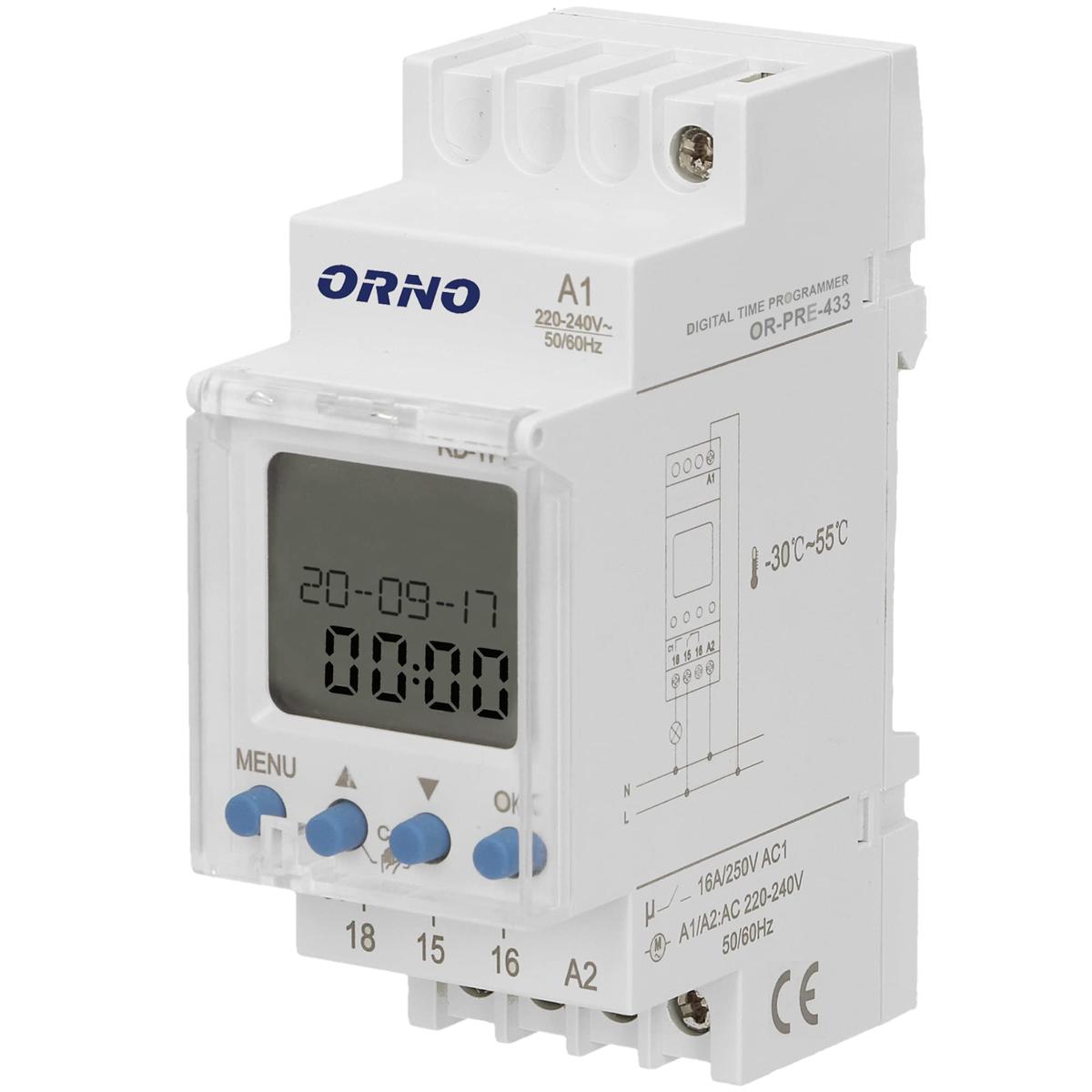 Programator elektroniczny ORNO na szyn DIN OR-PRE-433 Model: OR-PRE-433 Przeznaczenie Programator z wywietlaczem LCD przeznaczony do montau na standardowej szynie DIN. Suy do ustawiania czasu wczania i wyczania urzdze elektrycznych takich jak: owietlenie, ogrzewacze wody, silniki, pompy itp. Urzdzenie posiada52 programy czasowe (26 cykli wcz/wycz)wywietlacz LCDustawienie cyklu dziennego, tygodniowego lub impulsowegoautomatyczne przeczanie czasu letniego/zimowegoautomatyczne przenoszenie dni roboczychpodtrzymanie ustawie zegara w przypadku zaniku prduobudowa 2-moduowa3 jzyki menu do wybory (polski, angielski i niemiecki) Specyfikacja Napicie zasilania230V~, 50Hz Max. obcienie 2300W Prd 16A Wbudowany akumulator nie Typ cyfrowy Ilo programw 52 Monta szyna DIN Stopie ochrony IP IP20 Wymiary (szer./wys./g. [mm]) 36 / 90 / 65 Inne cechy3 jzyki menu