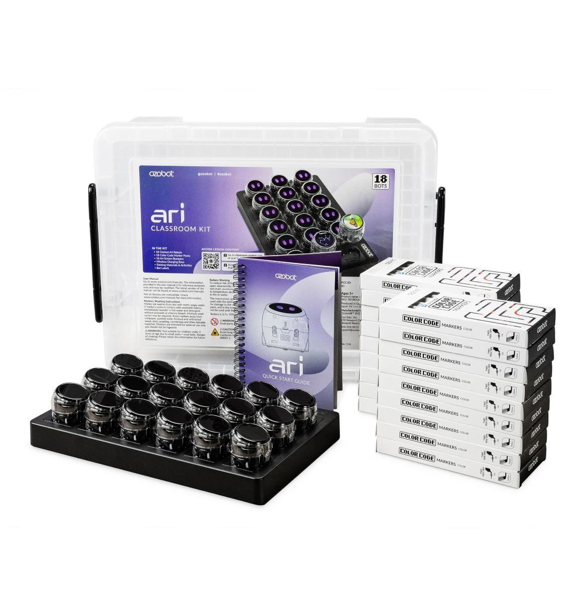 Το Ozobot Ari Classroom Kit είναι ένα σετ 18 ρομπότ με βάση φόρτισης που φέρνει τον προγραμματισμό και την δημιουργική επίλυση προβλημάτων σε κάθε τάξη. Εύκολο να ξεκινήσετε με κωδικούς χρωμάτων και προγραμματισμό βασισμένο σε μπλοκ! Με touchscreen, δυνατότητες τεχνητής νοημοσύνης και διπλές επιλογές κωδικοποίησης, το Ari μετατρέπει τα μαθήματα σε οποιοδήποτε θέμα σε πρακτική εξερεύνηση. Το Ari συναντά κάθε μαθητή εκεί που βρίσκεται και αναπτύσσεται μαζί του.