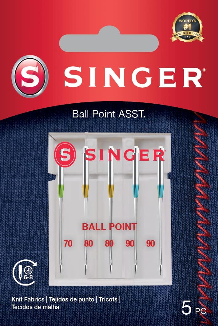 Πλεκτές βελόνες για ραπτομηχανές Singer, 5 τεμάχια, πάχος 1x70, 2x80, 2x90. Οι σφαιρικές βελόνες έχουν στρογγυλεμένη άκρη, που εμποδίζει τα πλέγματα από το να γλιτώνουν και να σχίζονται. Οι βελόνες Singer έχουν χρωματική σήμανση του τύπου βελόνας στο στέλεχος: Μεταλλικές (για μεταλλικά νήματα - χωρίς χρωματική σήμανση), Quilting (για quilting)
