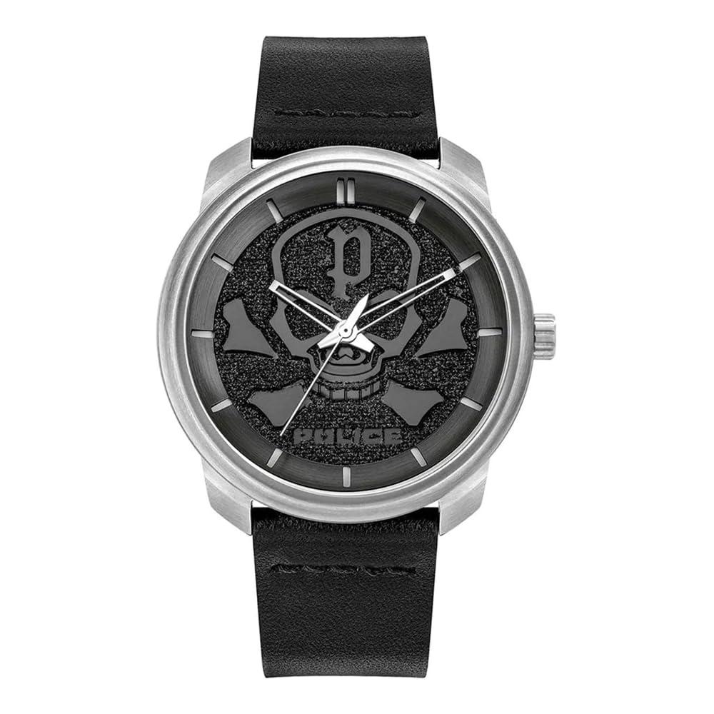 Police Bleder PL.15714JS/02 Mens Watch Stainless steel case, silver colored coating, mat Leather strap, black, pin buckle Quartz movement, battery operated Water Resistant Dial color black Case width around 44 mm Case height around 10 mm Comes with booklet and box.