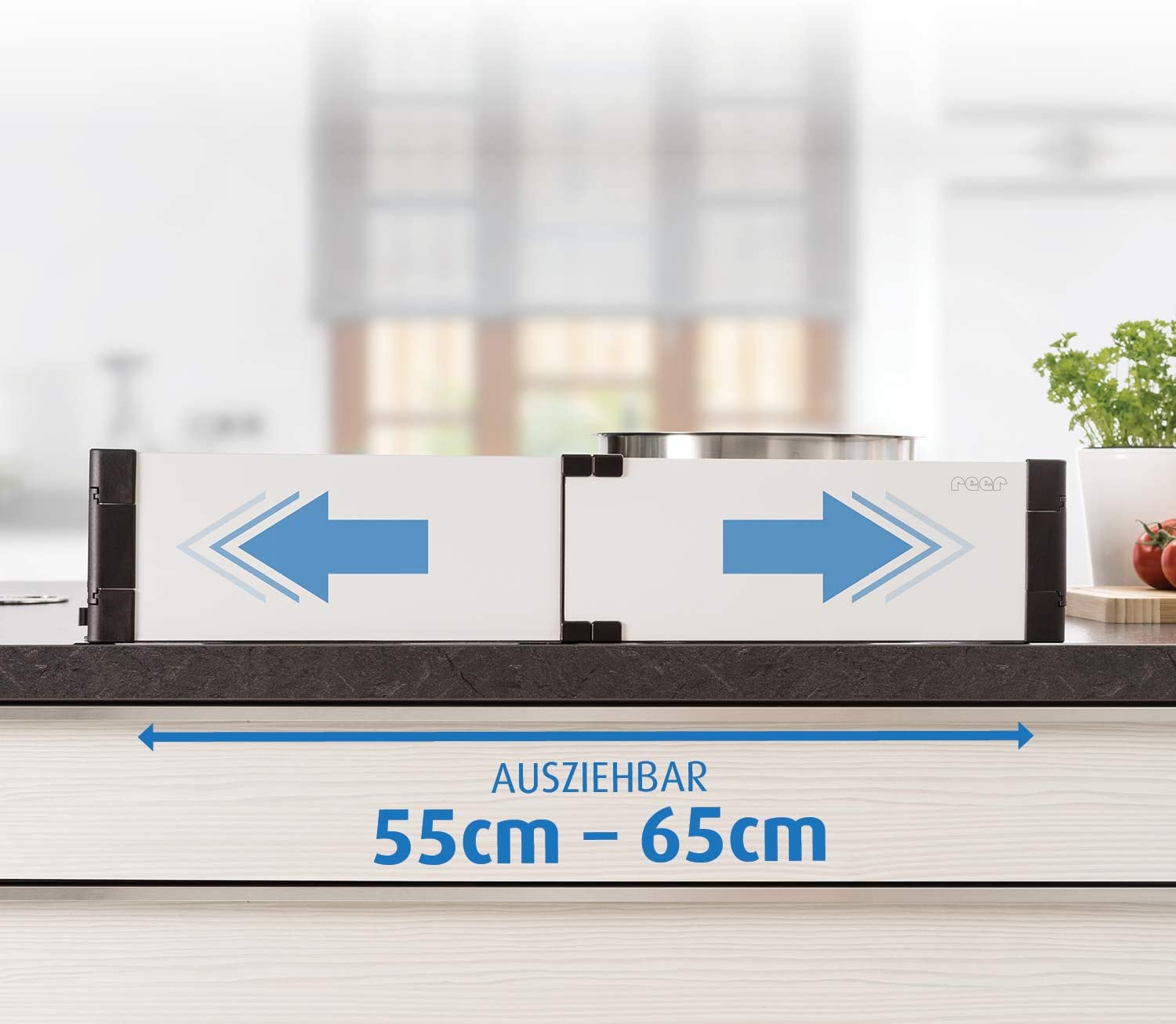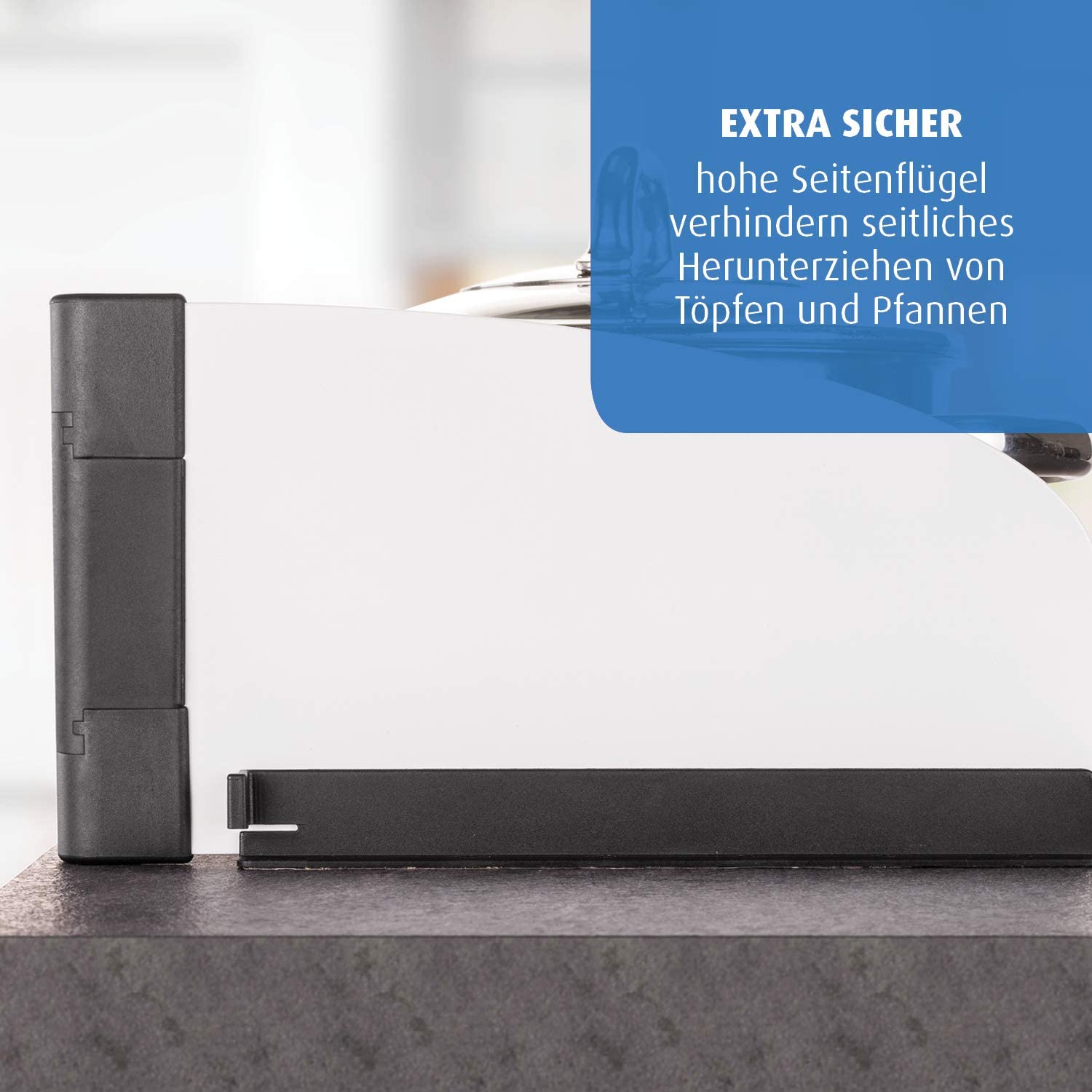 With an extended height of 12 cm, the stove guard is high enough to prevent your child from reaching over it. Its fully closed construction means it’s not possible to reach through the guard. 22-cm-long side panels provide additional protection. They make it impossible to pull down any pots or pans from the side.