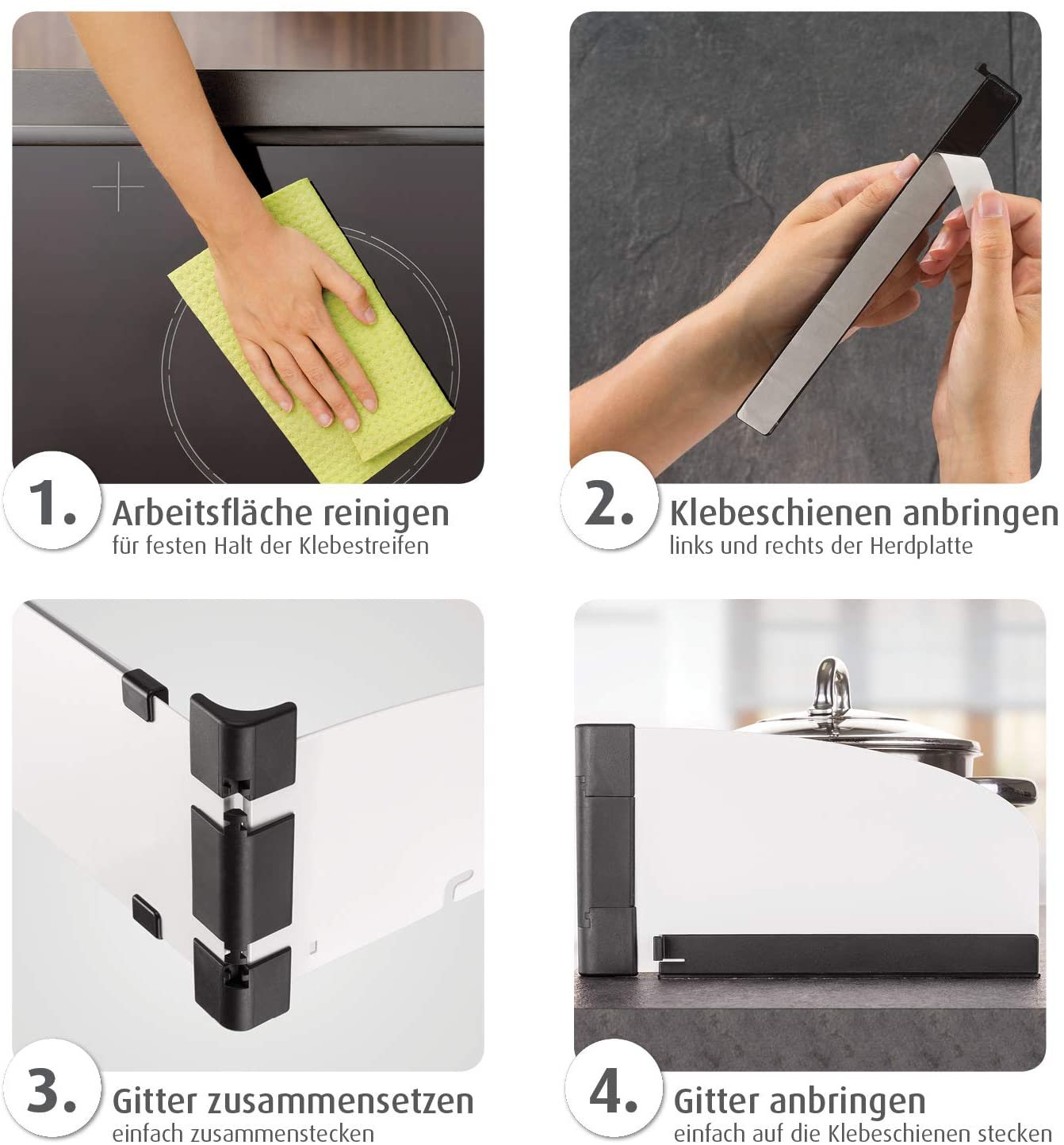 The guard’s clever plug-in system makes it easy to assemble and disassemble it in just a few simple steps. The specially developed adhesive tape ensures secure attachment of the stove guard without the need for tools. If stove protection is no longer required, the adhesive tape can be removed without leaving any residue.