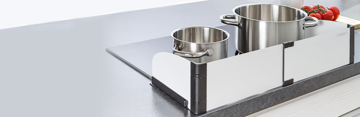 The stove guard can be used on both electric and induction stoves. Its width can be adjusted in the range of 55 - 65 cm, for a perfectly precise fit with your cooktop. The stove guard’s mounting strips are attached directly to the kitchen top using special adhesive tape, allowing it to be conveniently attached to any worktop, regardless of surface material and thickness.