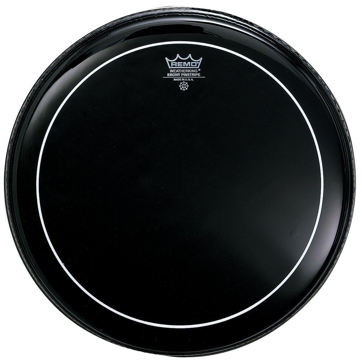 Batter, Pinstripe, Ebony, 12"" Diameter. The Ebony Pinstripe heads are made with two (10- & 5-mil) Mylar plies with a measured layer of a ring reducing agent applied between them at the outer edge of their trademark stripe to dampen high frequency overtones for warm resonance. Ebony Pinstripes quick decay makes them ideal heads for the fat sounds of Rock and R&B and for those who want more low end sounds with moderate attack and response characteristics.
