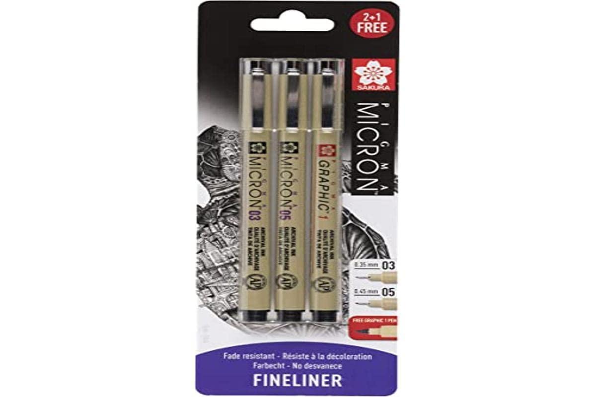 This packaging contains 1x Pigma Micron 03, 1x Pigma Micron 05 and 1x free Graphic pen. The Pigma Micron 0.35 mm and 0.45 mm fineliners are ideal for handlettering, bullet journaling and zentangle. The Pigma Graphic 1.0 mm pen has a special nib for drawing broad lines which is ideal for graphic artwork, manga, cartoons and scrapbooking. The unique sakura pigma ink will not bleed through paper, is permanent, waterproof, fade resistant, quick drying and pH-neutral.