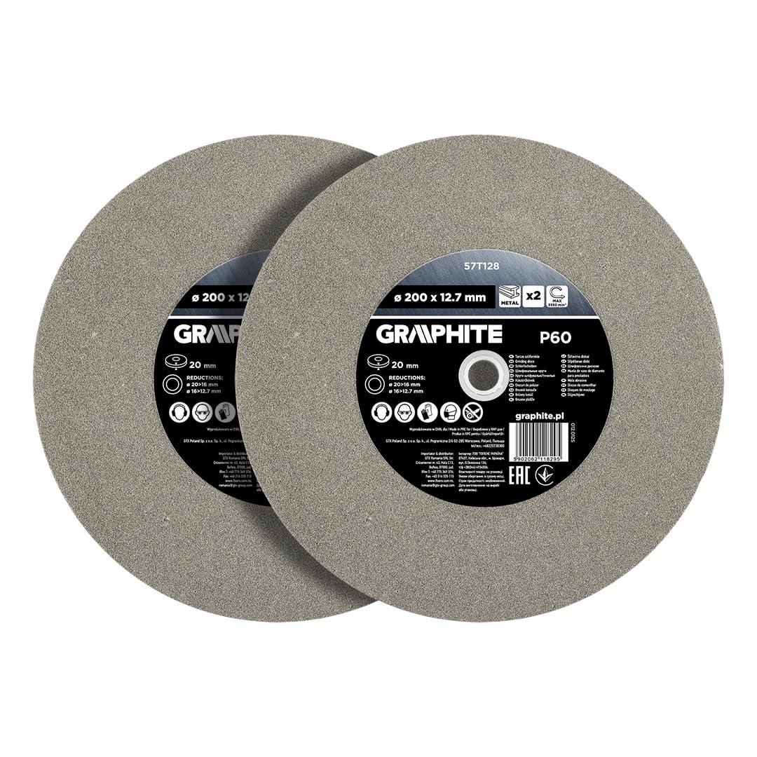 Tarcze szlifierskie 200 x 20/16/12.7 x 16 mm, gradacja P60, 2 szt w zestawie, rednica zewntrzna 200 mm, rednica wewntrzna otworu montaowego 12,7 mm,redukcje w zestawie 20 >16 oraz 16 > 12,7 mm, grubo: 20 mm, maksymalna prdko obrotowa 3350 obr./min, zastosowanie: metal