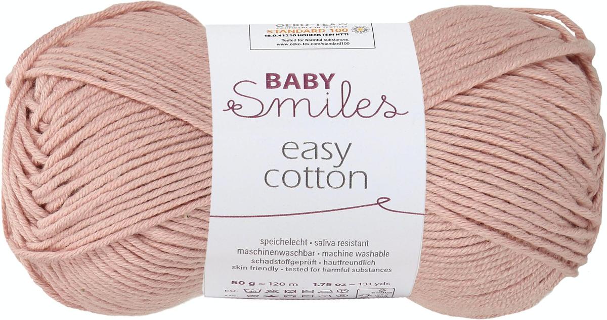 Το Baby Smiles Easy Cotton είναι ένα μαλακό νήμα για όλες τις εποχές, κατασκευασμένο από ένα μίγμα βαμβακιού-ακρυλικού. Η προσθήκη ακρυλικού κάνει το νήμα εξαιρετικά εύκολο στη φροντίδα (πλυσίμου και σιδερώματος στο πλυντήριο) και έχει μια όμορφη μαλακή αίσθηση. Το νήμα είναι πιστοποιημένο σύμφωνα με το Standard 100 by OEKO-TEX®, κατηγορία προϊόντος I, και είναι επομένως ιδανικό για ευαίσθητο δέρμα μωρού.