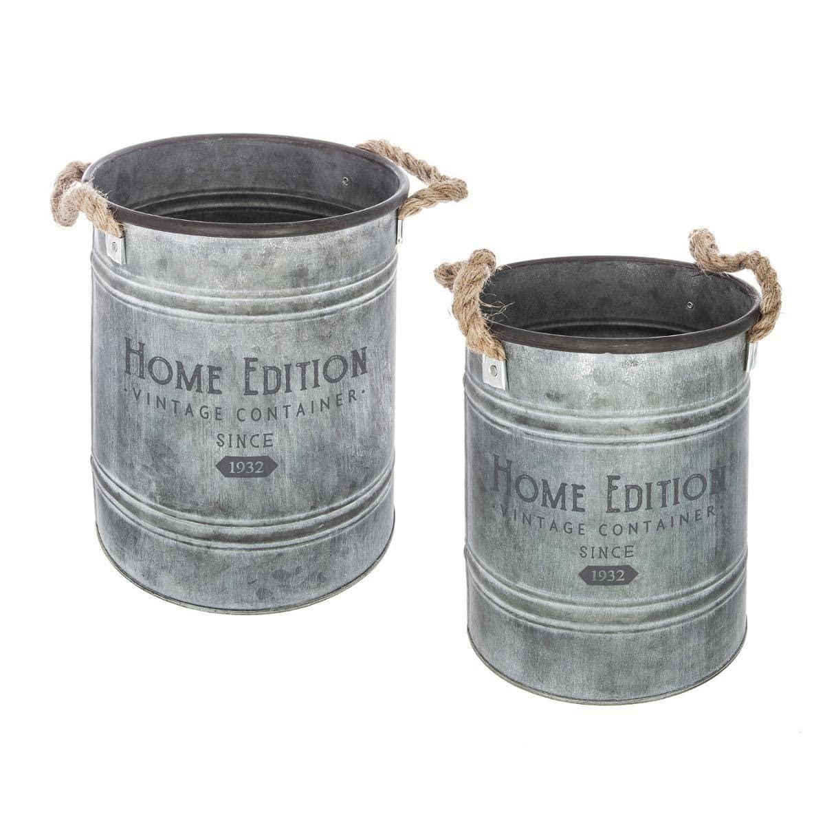 Set of 2 plant pot covers in two sizes, made of metal with a rustic character. Suitable for indoor, outdoor, and balcony use. Equipped with handles for easy transportation and a strong and stable construction to protect plants from falling. Gray color to highlight the natural shades of plants.