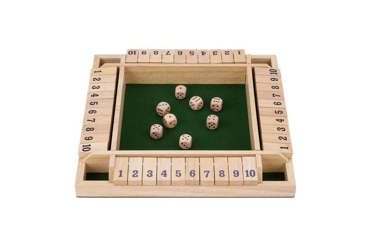 Gra Shut the Box To gra zawierajca 2 koci i kwadratow aren dla 2, 3 lub 4 graczy. Po kadej stronie areny znajduje si 10 ponumerowanych klapek od 1 do 10.Celem gry jest zamknicie wszystkich klapek na swojej planszy lub, jeli to niemoliwe, jak najwikszej ich liczby. Kady gracz stara si to osign, rzucajc komi i zamykajc klapki, dopki nie bdzie ju mona wykona adnego ruchu.