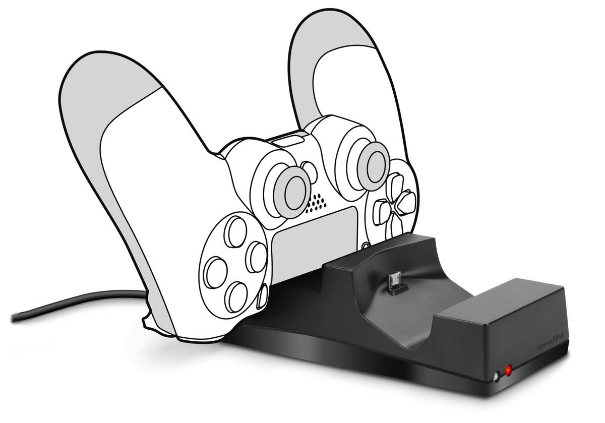 The Jazz USB Twin Charger will charge your wireless PS4 gamepads quickly and reliably. The compact charging station is powered directly by the console or any other USB port (at least 500 mA) such as on your PC or notebook. The device can charge up to two DualShock4 controllers at the same time, and will keep them securely in place thanks to its robust construction and non-slip base.Charging station for original PS4 gamepadsStable standingCompact designConvenient clip-on systemCharge via the console or any USB portSimultaneously charge up to two DUALSHOCK4 controllersPractical LED status indicators