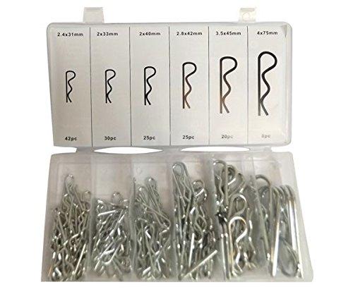 Spring locking split pin kit. 2x30 - 42 pcs 1,6x35 - 30 pcs 1,6x40 - 25 pcs 2,2x42 - 25 pcs 3,2x48 - 20 pcs 3,8x72 - 8 pcs Galvanised, total 150 pcs. Packed in a plastic box.